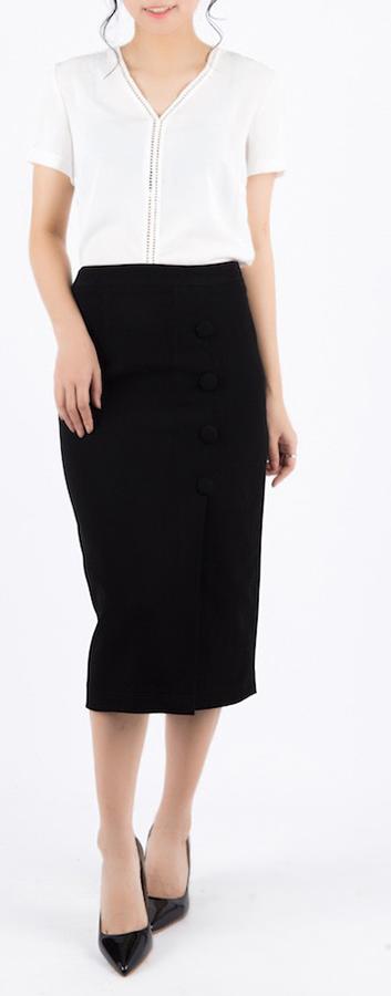 ✨Chân Váy Midi Cúc Bọc De Leah - Đen