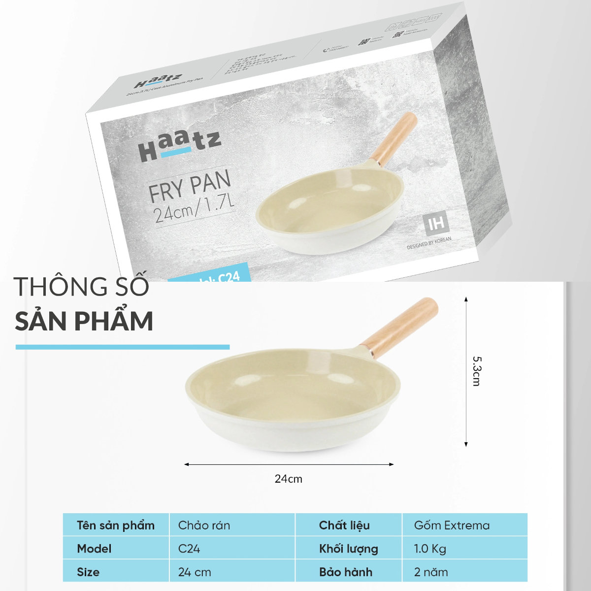 Chảo chống dính phủ gốm Haatz Hàn Quốc size 24cm đáy từ Dòng sản phẩm: Chảo rán, chảo chiên Model: C24 Thương hiệu: Haatz Hàn Quốc Kích thước: Ø24 x cao 5.3 cm (cán dài 20cm, đường kính