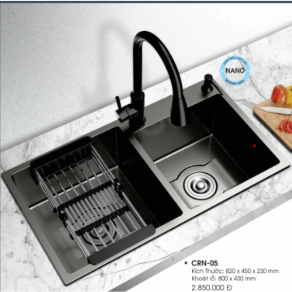 Inox phủ bạc Nano kháng khuẩn Kích thước chậu: 600x450x228mm Kích thước hố :560x400x230mm KT khoét đá: 570x420mm