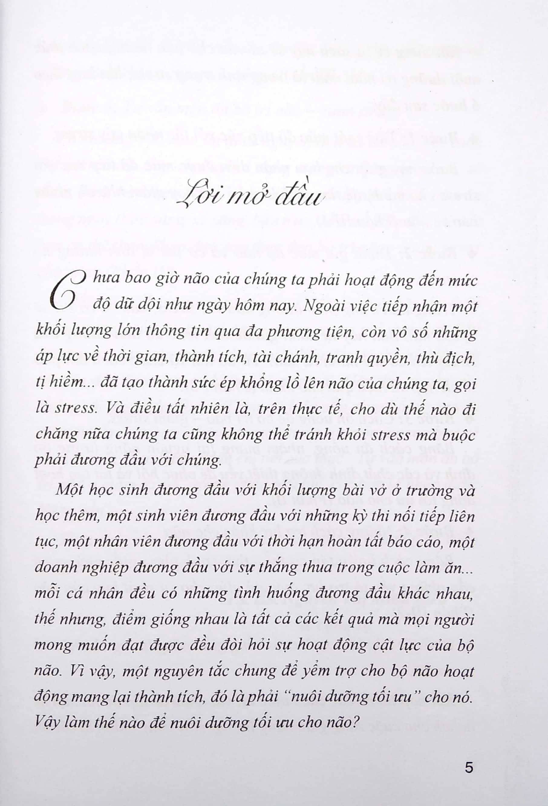 Cuốn sách này sẽ tư vấn cho bạn những cách thức nuôi dưỡng trí não, nhất là trong tình trạng stress, lần lượt theo 6 bước sau đây: Bước 1: Tầm soát mức độ tiếp