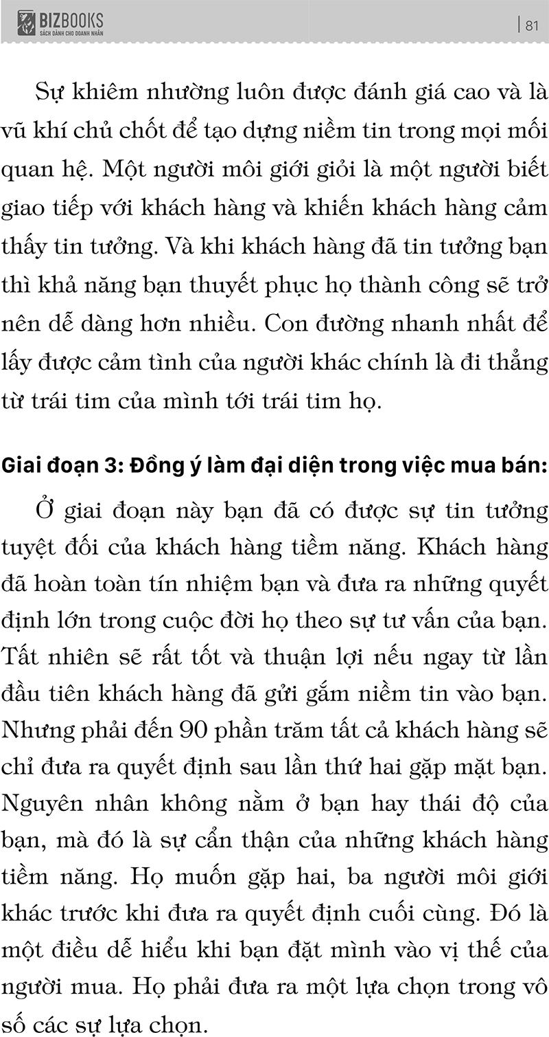 Những tư duy mới của tác giả sẽ khiến bạn thay đổi. Nếu trước đây bạn nói KHÔNG nhiều hơn, còn bây giờ bạn chỉ nói CÓ vì với tư duy mới thì không một mong muốn nào của khách hàng mà bạn nghĩ rằng mình không thể tìm kiếm cho họ một BĐS phù hợp.