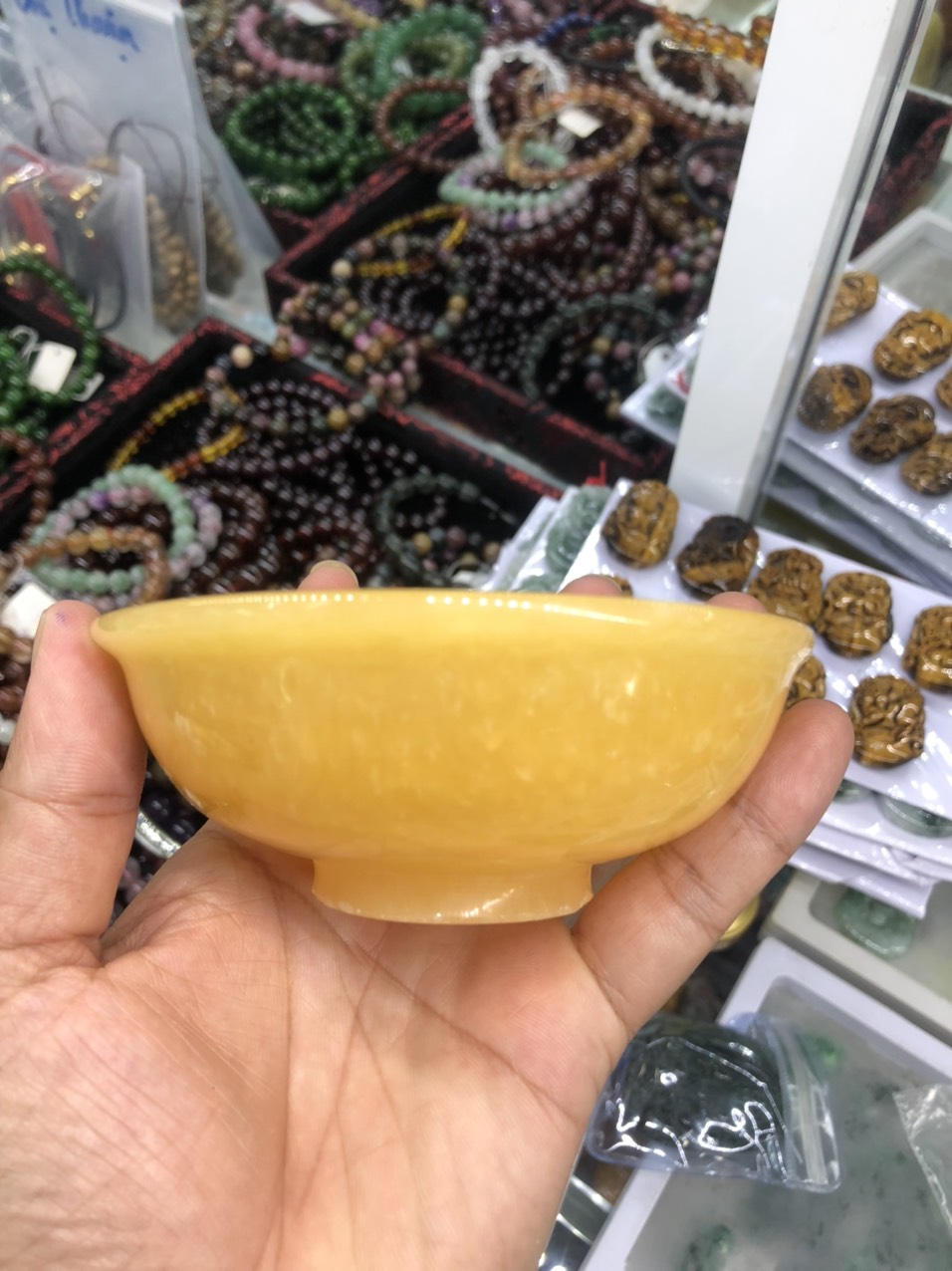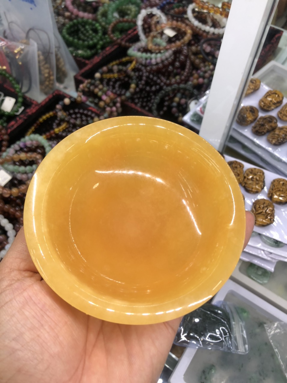 Chất liệu: Đá ngọc hoàng long Kích thước: Đường kính 10,5cm; Cao 4cm; Sâu 2,7cm Khối lượng: 260g