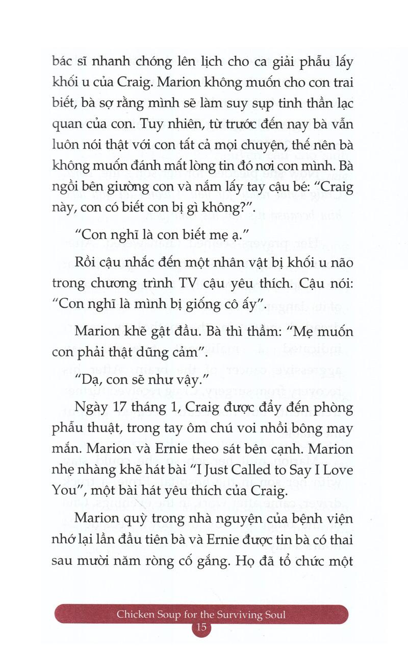 Câu chuyện về cô bé Searra mắc bệnh u não nhắc chúng ta nhớ rằng không nên hời hợt với những người mình yêu thương và phải nhìn nhận sâu sắc hơn những điều nông cạn chúng ta thường gặp trong cuộc số Còn nhiều những câu chuyện khác thật sự làm rung động bạn, mang đến động lực để bạn vượt những khó khăn của chính bản thân mình. Và kết thúc cuốn sách là câu chuyện về những cậu bé tình nguyện cạo trọc đầu để giúp người bạn bị ung thư không bị lạc lõng khi cậu bị rụng tóc do việc hóa trị.