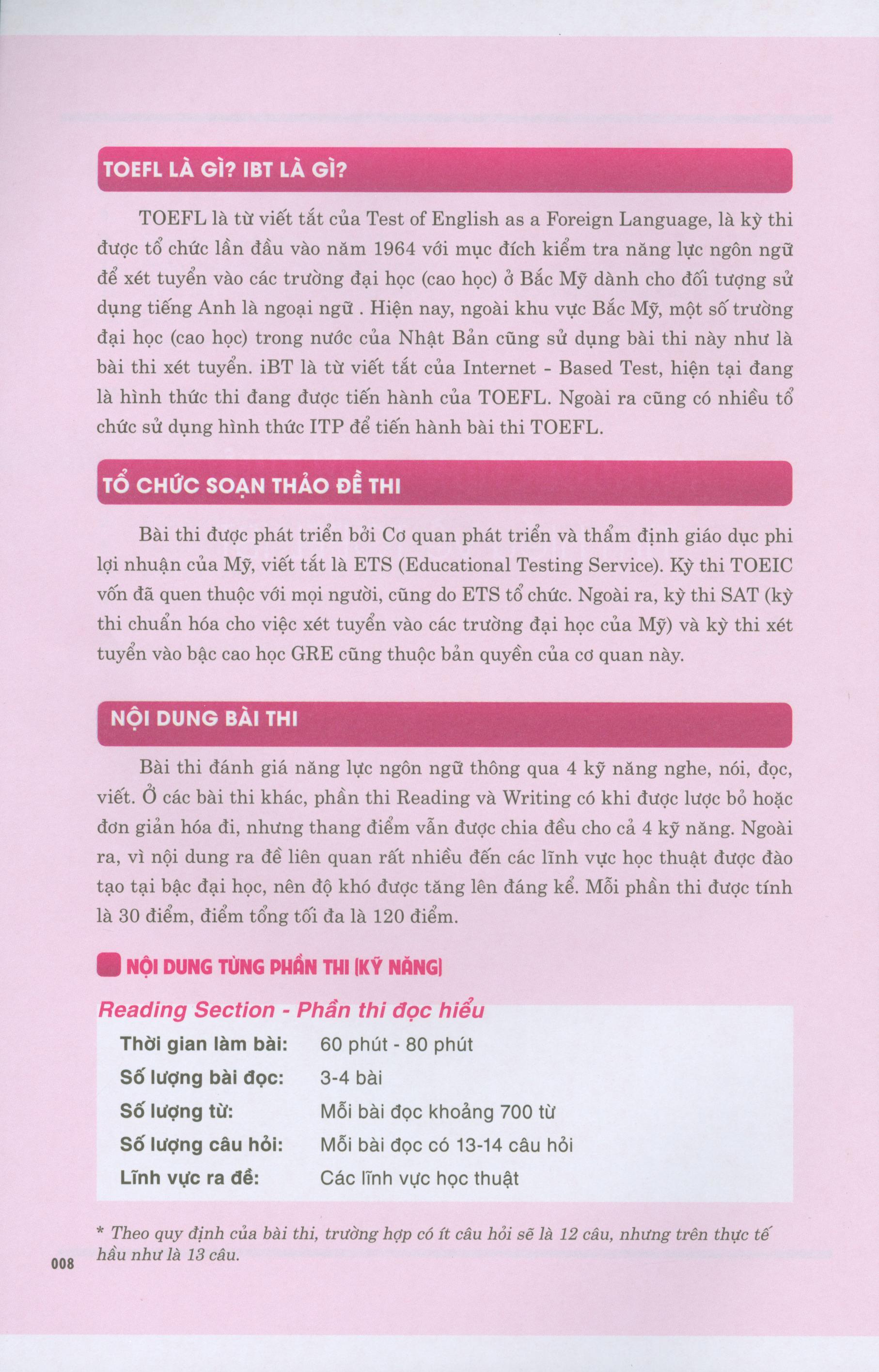 TOEFL iBT M Reading (Intermediate Level) TOEFL iBT M - Reading được biên soạn nhắm đến đối tượng là học viên ở trình độ trung cấp. Phần nội dung bao gồm 8 chương đựơc chia