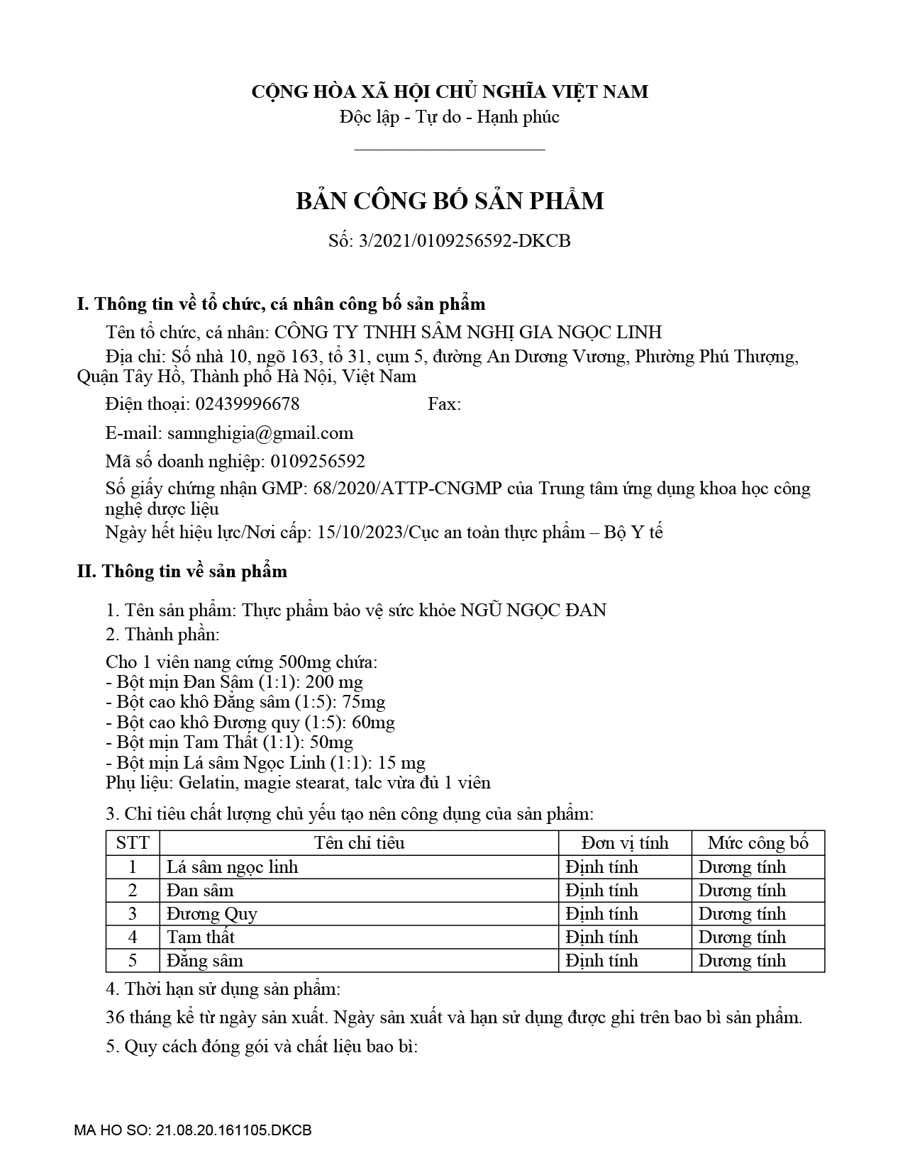 Viên Ngũ Ngọc Đan được các chuyên gia Công ty TNHH Sâm Nghị Gia Ngọc Linh và Trung tâm Ứng dụng khoa học công nghệ dược liệu – Viện Dược liệu, Bộ Y tế nghiên cứu và sản xuất; đạt tiêu chuẩn GMP. Sản phẩm được đầu tư và phân phối độc quyền bởi Công ty TNHH Sâm Nghị Gia Ngọc Linh. Sản phẩm đã được chứng minh có công dụng rất tốt để bồi bổ cơ thể, hỗ trợ điều trị bệnh về gan, thận, tiểu đường, mỡ máu, huyết áp cao, mất ngủ, đau thắt ngực do mạch vành, người có nguy cơ tim mạch do ứ trệ tuần hoàn; đặc biệt, tăng cường sức khoẻ, tăng cường hệ miễn dịch,…