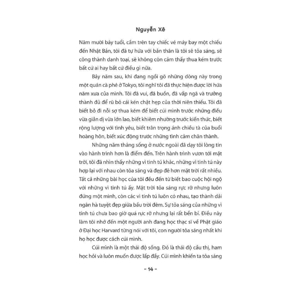 “Là một người trẻ lớn lên trong thời kỳ đất nước mới mở cửa và phát triển, tôi trưởng thành trong hệ thống trường chuyên lớp chọn và khát khao đổi đời của cha mẹ, nỗi sợ bị thua kém trong tôi đã từng lớn hơn bất cứ nỗi sợ nào tôi có trong đời. Năm mười bảy tuổi, cầm trên tay chiếc vé máy bay một chiều đến Nhật Bản, tôi đã tự hứa với bản thân là tôi sẽ tỏa sáng, sẽ công thành danh toại, sẽ không còn cảm thấy thua kém trước bất cứ ai hay bất cứ điều gì nữa”