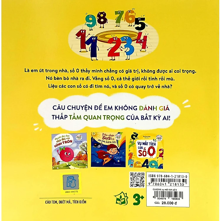 Câu chuyện "Vụ mất tích của số 0" sẽ giúp em hiểu ra, bất cứ ai cũng có giá trị riêng của mình, bất cứ ai, dù là đứng sau lưng hay phía trước người khác, đều có thể tỏa sáng. "Vụ mất tích của số 0" thuộc bộ sách "Chuyện ly kỳ về hình khối - màu sắc - số đếm". Bộ sách này là các câu chuyện liên quan đến các con số, hình khối, màu sắ luyện cho em nhanh tay, tinh mắt, nhận diện ra giá trị của con số, sắc màu, đồ vật chung quanh mình. Bộ sách gồm các tựa: Vụ mất tích của số 0 Chuyến dạo chơi nhớ đời của hình tròn Siêu nhân Su Si và phù thủy Xám Xịt
