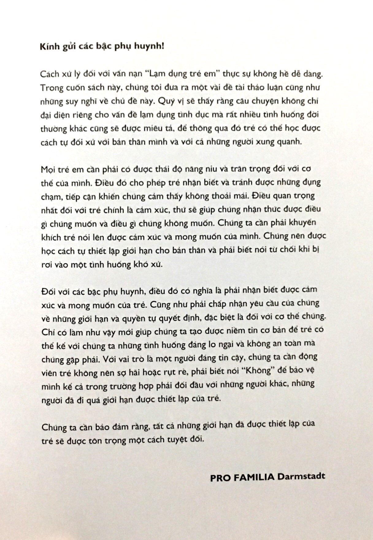 Cuốn sách này được tạo nên bởi những hình ảnh đáng yêu với cốt truyện rõ ràng, nhấn mạnh vào thái độ CON TÔN TRỌNG CƠ THỂ CON, CON TÔN TRỌNG NGƯỜI KHÁC VÀ MỌI NGƯỜI CŨNG CẦN TÔN TRỌNG CON.