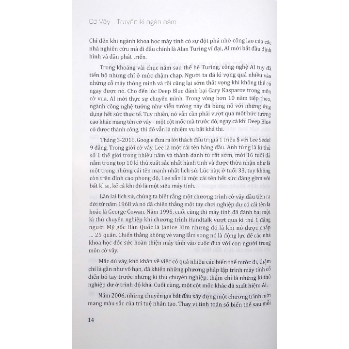Từng có câu nói về cờ vây “围棋千古以来无同局 - vi kỳ thiên cổ dĩ lai vô đồng cục” – nghĩa là: kể từ xa xưa cho đến về sau, không có ván cờ vây nào giống nhau. Miêu tả khái quát đó đã cho thấy nét tương phản giữa hình thức và nội dung của cờ vây, tuy cách thức chơi cực kì đơn giản chỉ hai màu quân đen và quân trắng, nhưng tiềm ẩn nội dung phong phú, đa dạng trong chiến lược, chiến thuật… Không phải vô cớ, mà các nhà khoa học đã chỉ ra tác dụng của hoạt động chơi cờ vây là khiến cho cả hai bán cầu não của người chơi đều hoạt động và nhờ đó não bộ sẽ phát triển tốt trong quá trình chơi cờ. Những người tiếp xúc với bộ môn thú vị này đều không khỏi bị nó hấp dẫn, rồi dần dần sự tò mò và quan tâm đến nso sẽ tang dần theo năm tháng luyện cờ. Đối với những người nhập môn, còn gì tuyệt vời hơn một cuốn sách tổng hợp được tất cả những thông tin về lịch sử cờ vây, sự phát triển của cờ vây trên thế giới cũng như những sự kiện thú vị về các kì thủ trong quá khứ. Thông qua cuốn sách, người đọc sẽ cùng vén tấm màn phiêu lưu vào thế giới cờ vây – truyền kì ngàn năm Lời khuyên của Biên tập viên dành cho việc đọc cuốn sách Cuốn sách này dành tặng cho những người trẻ vẫn đang mê mải tìm kiếm những thông tin ít ỏi mà vô cùng thú vị về cờ vây – môn cờ huyền bí đã có lịch sử cả nghìn năm. Tuy có bề dày lịch sử tại các quốc gia đồng văn như Hàn Quốc, Trung Quốc và Nhật Bản nhưng đây lại là món ăn tinh thần còn khá mới mẻ tại Việt Nam hiện nay. Với lối viết rất gãy gọn, tổng hợp nội dung rất súc tích và dễ “thấm”, tác giả đã khéo léo mang đến cho người đọc một góc nhìn rất mới lạ về môn cờ tưởng chừng rất đơn giản mà đầy sức hấp dẫn này. Có thể nói, cuốn sách của anh là một cuốn sách không thể bỏ qua đối với những người nhập môn trò chơi này. Câu nói hay dành tặng bạn “Cuối cùng, việc tranh giành địa bàn trên bàn cờ cũng chẳng khác nào trên thương trường. Chỉ một quyết định sai lầm, bạn cũng có thể mất đi một đám quân lớn. Và khi bạn giành được tiên thủ, điều đó không khác gì bạn đi trước đối phương một bước để chiếm lĩnh lấy thị trường. Nhưng nếu nước đi đó không chính xác, cơ hội sẽ lại chuyển về tay kẻ khác.” Tác giả Vũ Hoàng Bản thảo tuyệt vời của Vũ Hoàng, một tác giả đã dành gần chục năm để tổng hợp và nghiên cứu về môn cờ vây. Tác giả cũng đã từng có nhiều bài viết trên blog cộng đồng nhằm nâng cao sự hiểu biết của mọi người về món ăn tinh thần này và nhận được rất nhiều sự ủng hộ và theo dõi của người chơi.