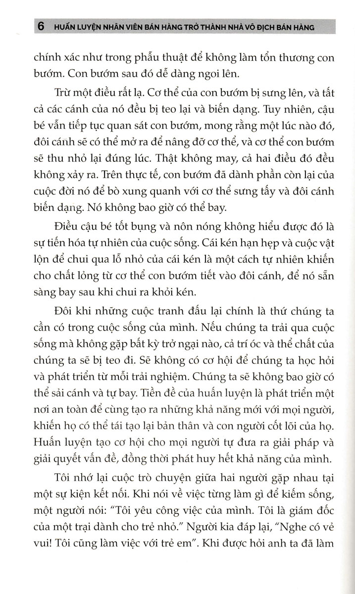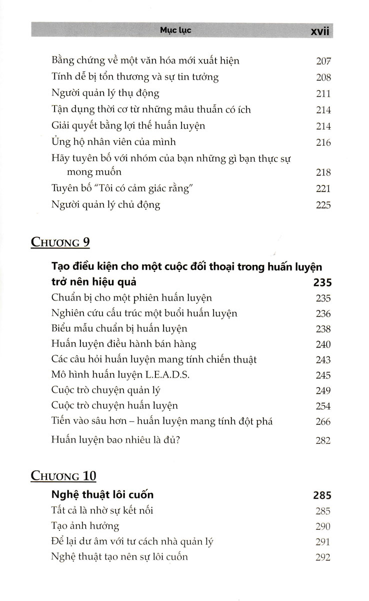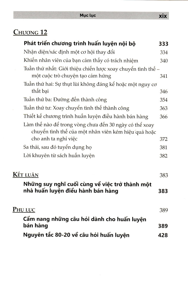 Cuốn sách này bao gồm các nghiên cứu điển hình, chiến lược xoay chuyển tình thế trong 30 ngày dành cho những người làm việc kém hiệu quả, một thư viện gồm các biểu mẫu và kịch bản huấn luyện, cũng như hàng trăm câu hỏi huấn luyện mạnh mẽ. Bạn có thể sử dụng ngay lập tức để huấn luyện bất kỳ ai trong mọi tình huống. Huấn Luyện Nhân Viên Bán Hàng Trở Thành Nhà Vô Địch Bán Hàng là cẩm nang của bạn để tạo ra một nền văn hóa huấn luyện tiến bộ và xây dựng đội ngũ những nhân viên hàng đầu .
