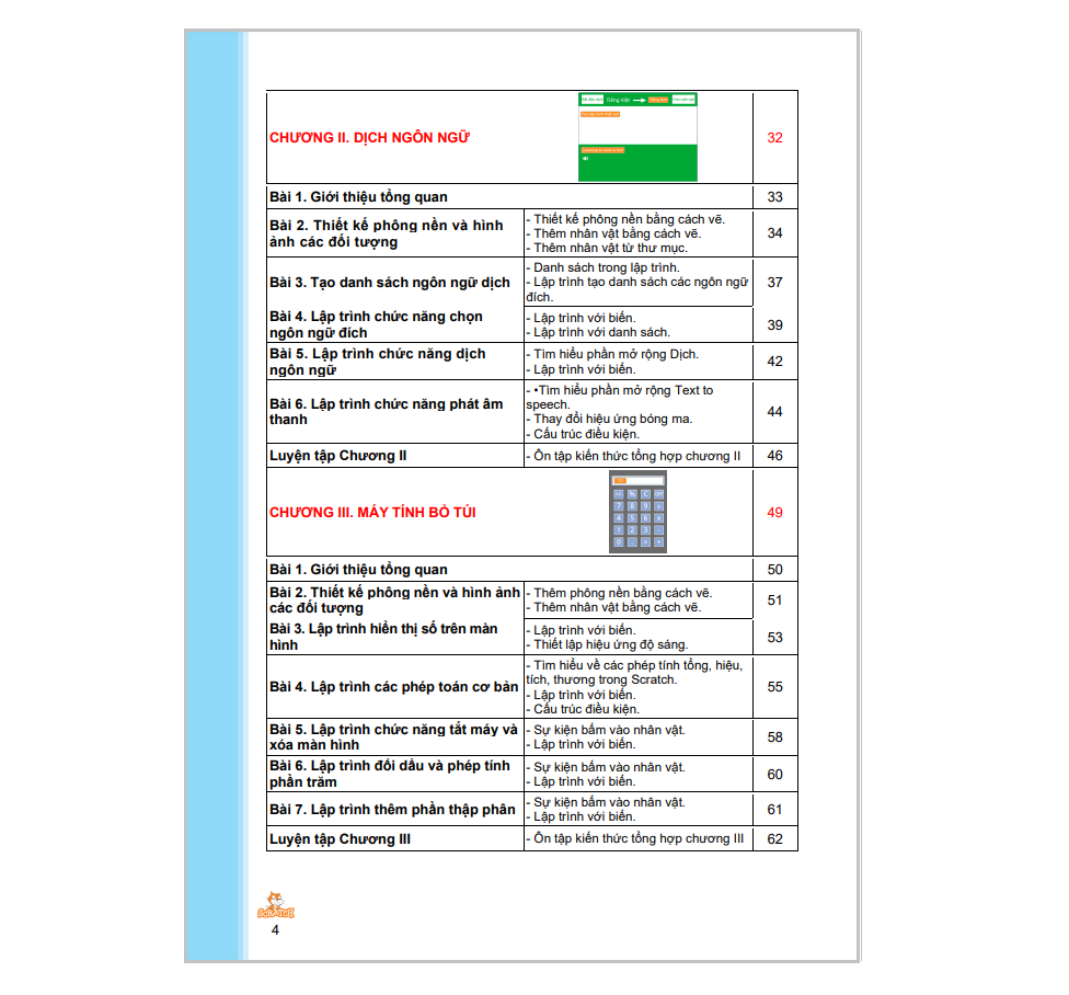 Cuốn sách Coding 5 lập trình với Scratch 3 bao gồm 06 chương, cung cấp những kiến thức tiếp theo về lập trình như: vòng lặp lồng nhau, thủ tục, danh sách, … thông qua ngôn ngữ lập trình Scratch 3. Từng chương trong cuốn sách Coding 5 sẽ giúp trẻ xây dựng lên các phần mềm phù hợp với lứa tuổi và gần gũi với các môn học khác như: Trắc nghiệm tiếng Anh, trò chơi trắc nghiệm, tri ân thầy cô, máy tính bỏ túi, trò chơi Điện biên phủ trên không, dịch ngôn ngữ.