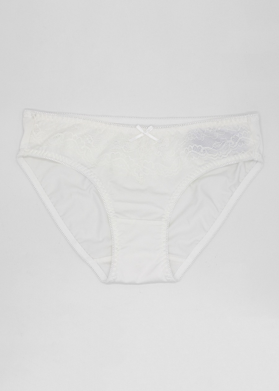 - Kiểu dáng Bikini (quần cạp thấp) trẻ trung ôm trọn vòng ba, kết hợp họa tiết ren nữ tính tạo nên sức hút riêng biệt.