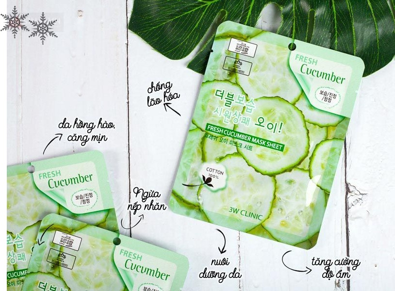 - Fresh cucumber mask sheet là mặt nạ chiết xuất từ dưa leo có tác dụng dưỡng ẩm giúp làn da khô của bạn trở nên mịn màng đồng thời Làm mềm mịn da, giúp da trắng sáng tự nhiên, tăng khả năng hồi phục những tổn thương về da và mang lại độ sáng bóng hoàn hảo.