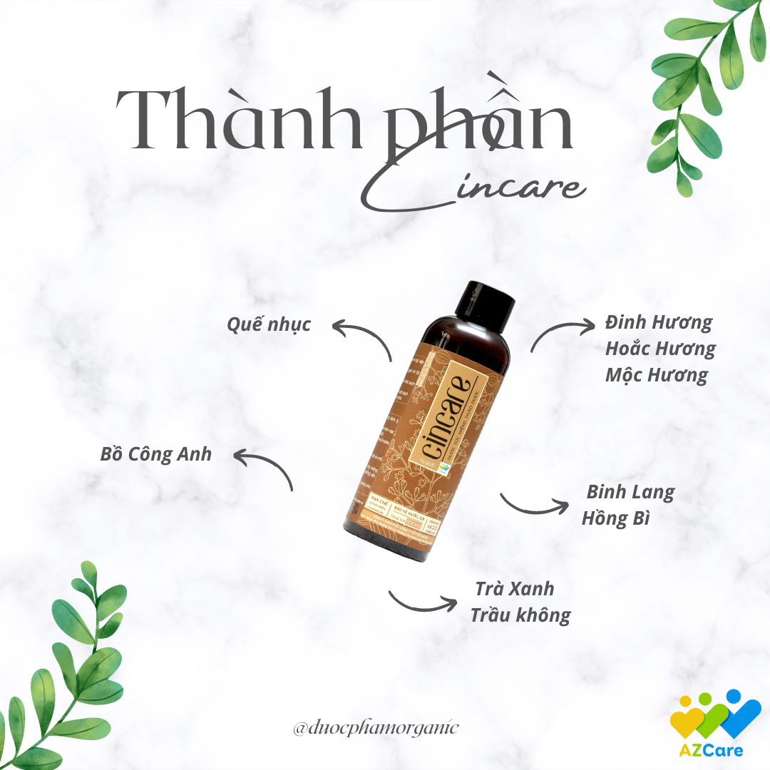 NƯỚC SÚC MIỆNG THẢO DƯỢC CINCARE: 100 NGƯỜI DÙNG, 99 NGƯỜI KHEN Theo kết quả của nghiên cứu lâm sàng, 100% hết đau rát do nhiệt miệng sau 2 ngày 99,9% vi khuẩn có hại bị “đánh bay" khỏi khoang miệng sau mỗi lần sử dụng 24 TIẾNG lưu giữ hơi thở thơm mát, nồng ấm từ quế nhục 2 PHÚT/NGÀY, giảm ngay chảy máu, đau nhức răng 3 NGÀY làm dịu khoang miệng bị lở loét, sưng đỏ của nhiệt miệng 30 GIÂY dọn sạch sẽ mảng bám, ngừa tích tụ cao răng, nha chu, viêm nướu 97% người sử dụng cảm nhận hiệu quả cải thiện sức khỏe răng miệng đầy tích cực 100% không cồn, không paraben, an toàn tuyệt đối cho mẹ bầu, mẹ bỉm sữa và trẻ nhỏ Là thành quả của đội ngũ chuyên gia về dược liệu dày dạn kiến thức và hơn 10 năm kinh nghiệm của AZCARE, nước súc miệng Cincare là sản phẩm đầu tiên trong hành trình hiện thực hóa giấc mơ cung cấp sản phẩm chăm sóc sức khỏe an toàn, bền vững từ thảo mộc cho hàng triệu người tiêu dùng Việt. Hướng dẫn sử dụng: Ngày dùng 2 lần, sáng sau khi ngủ dậy và tối trước khi đi ngủ.  Súc miệng khoảng 10ml, ngậm từ 30 giây đến 1 phút rồi nhổ ra.  Có thể pha loãng gấp đôi với nước sạch để súc miệng (Lưu ý: dùng hết ngay sau khi pha). Không cần súc miệng lại với nước sạch.  Đối tượng phù hợp: Người bị chảy máu chân răng, bệnh lý nha chu, hôi miệng.  Viêm họng, viêm amidan, viêm niêm mạc miệng, loét vùng miệng do nhiệt.  Mụn rộp vùng miệng do Herpes Simplex Virus. Người niềng răng.  Dùng sau điều trị răng hàm mặt và nhổ răng khôn.  Phòng ngừa nhiễm khuẩn răng miệng cho bệnh nhân nằm lâu ngày, không vận động. Để rõ hơn về tình trạng cũng như giải pháp cải thiện sức khoẻ răng miệng hiện tại của mình và cả gia đình, đừng ngần ngại inbox ngay cho fanpage AZCARE để được tư vấn và thăm khám online miễn phí bởi đội ngũ thạc sĩ, bác sĩ nha khoa chính quy ĐH Y Hà Nội nhé!