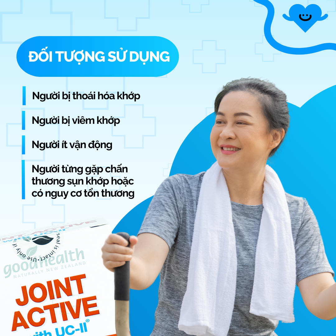 GIỚI THIỆU SẢN PHẨM GOODHEALTH JOINT ACTIVE  Viên sụn khớp Goodhealth Joint Active: Hộp 30 viên nang Sản phẩm Joint Active được nhập khẩu chính hãng từ Good Health New Zealand - thương hiệu nổi tiếng về các sản phẩm bảo vệ sức khỏe có nguồn gốc từ tự nhiên. UC-II được chiết xuất hoàn toàn từ sụn ức gà nên đảm bảo lành tính, an toàn cho người sử dụng. Dựa theo các nghiên cứu lâm sàng cho đến nay chưa ghi nhận tác dụng phụ nào từ UC-II cho những người gặp vấn đề về xương sụn khớp.    ƯU ĐIỂM NỔI BẬT  Bổ sung hoạt chất thế hệ mới UC-II (Collagen type 2 không biến tính)  UC-II (collagen type 2 không biến tính) trong thành phần của Viên sụn khớp Joint Active là hoạt chất thế hệ mới đã được nghiên cứu và kiểm định lâm sàng bởi Đại học Y khoa Harvard mang lại hiệu quả rõ rệt trong việc nuôi dưỡng và phục hồi sụn khớp bị tổn thương, tăng tiết dịch khớp trong trường hợp khô khớp, giúp giảm viêm, giảm đau và ngăn ngừa thoái hóa khớp.  Viên sụn khớp Joint Active hiện đang nhận được nhiều phản hồi tích cực từ những người gặp vấn đề về sụn khớp như dân văn phòng, người chơi thể thao và đặc biệt là người cao tuổi.   Cơ chế 3 tác động  Thành phần trong viên sụn khớp Joint Active được kết hợp với mục đích các chất bổ trợ nhau, giúp tăng cường hiệu quả của các chất còn lại.  Thông qua đường uống, Collagen tuýp II không biến tính bổ sung Collagen tại các sụn khớp, giúp giảm đau, tái tạo và nuôi dưỡng sụn khớp. Một phần UC-II được hấp thu còn giúp điều chỉnh đáp ứng miễn dịch, bảo vệ sụn khớp, hỗ trợ làm chậm quá trình thoái hóa khớp.  Bên cạnh đó, Vitamin D trong Joint Active giúp hấp thụ canxi và phospho phòng tránh loãng xương, bảo vệ xương dưới sụn giúp ngăn ngừa thoái hóa sụn.  Đặc biệt, Joint Active còn được bổ sung thêm Boron – vi chất dinh dưỡng giúp hấp thụ vitamin D, làm tăng mật độ xương giúp xương chắc khỏe, chống viêm, giảm viêm khớp, ngăn ngừa loãng xương.    Tác dụng và hiệu quả nhanh hơn  Hợp chất UC-II được đã được nghiên cứu, kiểm định lâm sàng bởi Đại học Y khoa Harvard an toàn và hiệu quả gấp 2,3 lần so với Glucosamine và Chondroitin.  Trên Tạp chí International Journal of Medical Science, nghiên cứu được đăng tải của tác giả David C. Crowley cũng cho thấy Collagen tuýp II không biến tính giúp hỗ trợ giảm tình trạng cứng khớp và khó vận động là 33%, hỗ trợ giảm tình trạng đau nói chung đến 44%, chỉ trong 90 ngày.   Không tác dụng phụ Các hoạt chất đều nghiên cứu ở hàm lượng an toàn, không gây ảnh hưởng tới tiêu hóa hay bất kì tác dụng phụ nào, hoàn toàn có thể sử dụng lâu dài.  THÀNH PHẦN CỦA VIÊN SỤN KHỚP JOINT ACTIVE    Trong mỗi viên Goodhealth Joint Active có chứa: Thành phần (cho 1 viên)  Sụn tiêu chuẩn hóa UC-II 40mg  Vitamin D 200IU Boron 2mg  CÔNG DỤNG SẢN PHẨM Tái tạo và duy trì sụn khớp  Hoạt chất UC-II với tác dụng kích thích tế bào sụn tăng sinh tổng hợp proteoglycan, cung cấp dinh dưỡng cho sụn khớp, kích thích cơ thể sản xuất các sợi collagen, bảo vệ sự đàn hồi của khớp giúp tái tạo sụn khớp, ức chế một số enzym phá hủy sụn khớp và các enzym kích hoạt phản ứng viêm.  Ngăn ngừa và hỗ trợ điều trị viêm khớp dạng thấp  Goodhealth Joint Active với UC-II là sản phẩm sử dụng được cho những người bị thoái hóa sụn khớp xương, những người mắc các bệnh sụn khớp cấp tính mãn tính, viêm khớp dạng thấp, thoái hóa khớp, thấp khớp.    Hạn chế thoái hóa khớp  Cơ chế 3 tác động từ UC-II, Vitamin D và Boron có tác dụng cung cấp dinh dưỡng cho sụn khớp, hút nước và các phân tử proteoglycan, kích thích tế bào sụn sản xuất proteoglycan. Tăng độ bền vững và dẻo dai của các sợi collagen, tăng sự đàn hồi của mô liên kết, ức chế các men tiêu protein, ngăn chặn quá trình thoái hóa sụn khớp.   Duy trì sức khỏe của xương  Bản chất của xương là mô sống và phát triển liên tục. Hai vật liệu cần thiết để tạo nên xương là collagen và canxi. Trong đó, collagen là một loại protein cung cấp khung mềm, canxi là một khoáng chất giúp tăng cường độ mạnh và cứng của xương. Sự kết hợp này giúp xương chắc khỏe và linh hoạt đủ để chống chọi với tác động từ bên ngoài.    Sự kết hợp của UC-II, Vitamin D và Boron trong thành phần viên sụn khớp Joint Active giúp bổ sung các dưỡng chất cho xương, từ đó giúp duy trì sức khỏe xương khớp ổn định.    Phòng tránh loãng xương  Khi đã qua 30 tuổi, quá trình mất xương có thể bắt đầu diễn ra nhanh hơn so với sự phát triển của xương mới. Qua thời gian, bạn có thể bị loãng xương lúc về già. Những người bị loãng xương thường bị gãy xương hông, cột sống và cổ tay.    Nếu bạn muốn có một hệ xương sụn khớp chắc khỏe và duy trì mật độ xương ở mức cao nhất thì Joint Active sẽ giúp cung cấp Collagen type 2 không biến tính, vitamin D, Bo