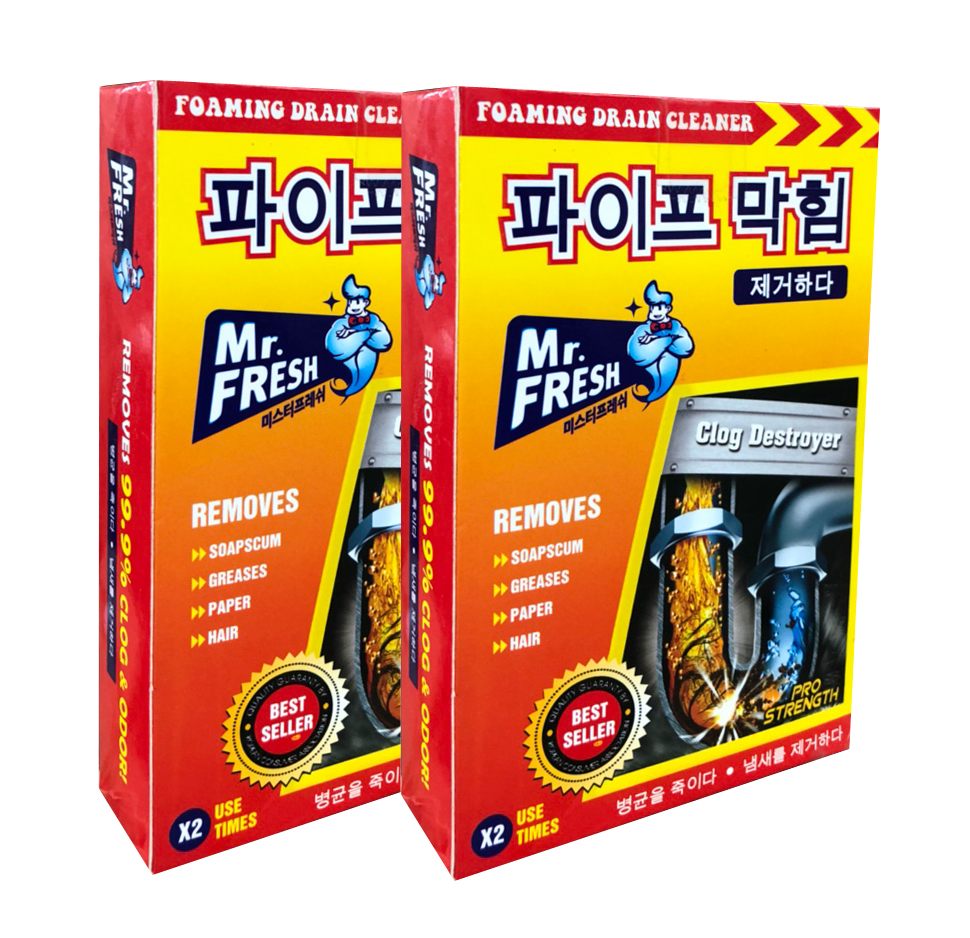 Bột thông tắc đường ống thoát nước Mr.Fresh Hàn Quốc là một trong những sản phẩm tốt nhất được bán chạy ở Hàn Quốc với công thức tiên tiến, các thành phần hóa học chuyên dụng, độ tẩy cực mạnh sẽ xoáy tan mọi cặn bẩn trong đường ống một cách hiệu quả.Sản phẩm sẽ thông sạch mọi loại cặn bẩn như giấy, rác, rau, mỡ, thịt, gạo, tóc… kẹt trong đường ống thoát nước của chậu rửa nhà bếp, lavabo, bồn tắm… mà không làm hư hại đường ống và các thiết bị vệ sinh.Bột thông tắc đường ống thoát nước Mr.Fresh Hàn Quốc trong thành phần của nó luôn có các hỗn hợp hóa học có độ kiềm, độ ăn mòn, độ phân hủy cực cao, giúp phân hủy các hợp chất hữu cơ, chất cặn bã có trong đường ống gây tắc nghẽn.