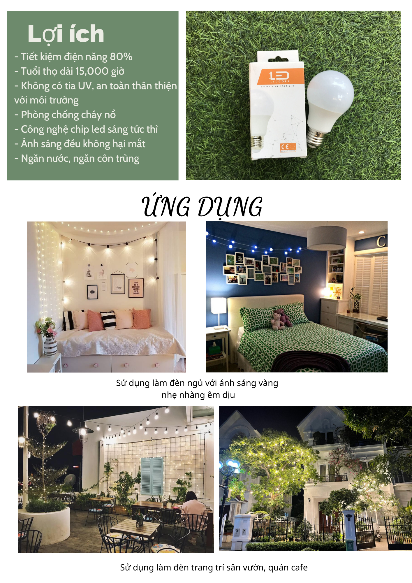 Đặc biệt: bóng đèn led bulb tròn 3W thường được sử dụng phổ biến để làm dây đèn trang trí cho các quán cafe, ban công, sân vườn với dây chăng đèn đảm bảo chống nước, ánh sáng đều, tuổi thọ bóng sử dụng lâu dài.