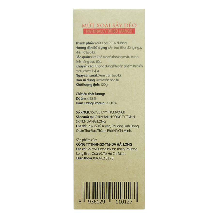 SẢN PHẨM CỦA HỘ KINH DOANH CƠ SỞ BÁNH MỨT THÀNH LONG 1 XOÀI SẤY DẺO Mứt Thuần Việt THÀNH PHẦN : : Trái xoài (80%), đường tinh luyện, muối i-ốt, chất bảo quản (E202),