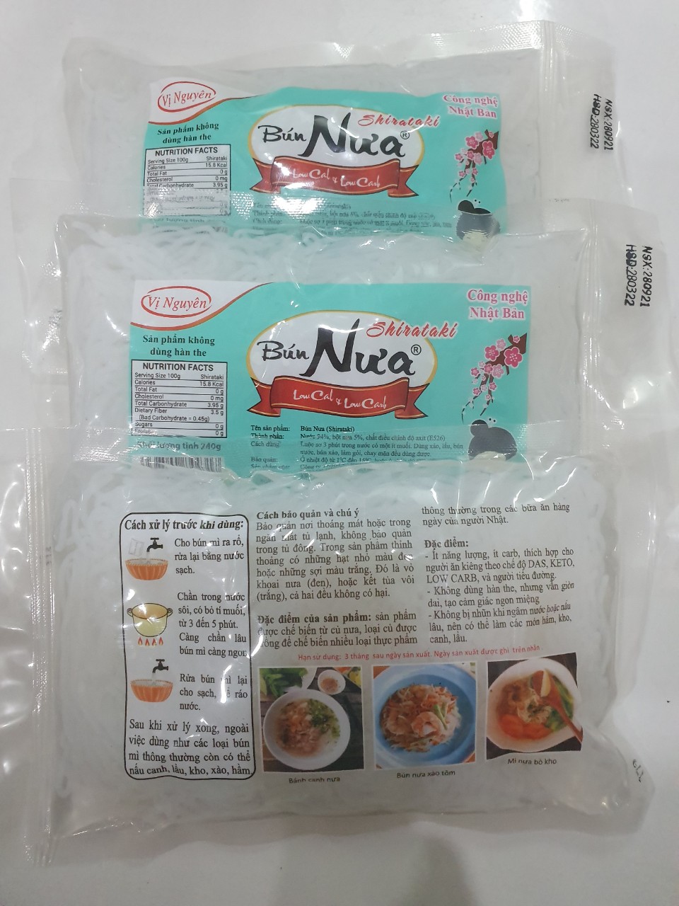 - Bảo quản: Nơi thoáng mát Những thực phẩm được làm từ bột Glucomanna có trong củ nưa, một chất xơ chứ không phải là tinh bột. Sản phẩm được sản xuất theo công nghệ Nhật Bản, không chất bảo quản. ️ THÀNH PHẦN: Bún nưa chiếm 97% chất xơ. Năng lượng 5-30kCal/100g ️ Cách sơ chế: mở hộp đổ bỏ nước muối ngâm, rửa qua bằng nước, thả vào nước sôi cho sôi lại 3-5′. Sau đó có thể chế biến đa dạng như bún miến bình thường như làm bún trộn, bún xào, hoặc bún nước, đặc biệt ăn lẩu với bún Shi cực chuẩn, vì đặc trưng của em nó là càng nấu lâu càng ngấm gia vị, đặc biệt là không hề trương hay nhũn, luôn luôn dai ngon. Bún có hàm lượng chất xơ rất cao, là loại củ có thành phần dinh dưỡng là 0 carb from sugar và gần như 0 kcal. phù hợp với mọi lứa tuổi, mọi chế độ ăn kiêng, kể cả DAS, Lowcarb.
