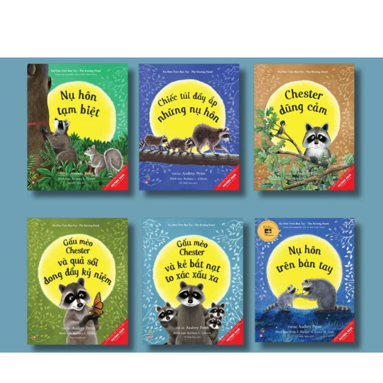 - Nụ Hôn Trên Bàn Tay - The Kissing Hand. Là tập mở đầu trong sê-ri sách thiếu nhi kinh điển, được yêu thích bởi hàng triệu độc giả nhỏ trên toàn thế giới. Đây là một câu chuyện tuyệt vời về sự yêu thương và thông điệp “bạn đang được yêu thương”. Chú gấu mèo Chester bé nhỏ lần đầu tiên phải đến trường nhưng cậu chẳng muốn đi chút nào cả. Để giảm bớt nỗi lo sợ của Chester, mẹ của cậu đã chỉ cho cậu một bí mật gia đình, được gọi là Nụ Hôn Trên Bàn Tay. Chester rất thích nụ hôn của mẹ trong lòng bàn tay mình và mang nó đến trường, nhờ vậy cậu luôn cảm nhận được sự yêu thương của mẹ dành cho mình bất cứ lúc nào, ở bất cứ chỗ nào và không còn cảm thấy sợ hãi chuyện đến trường nữa.