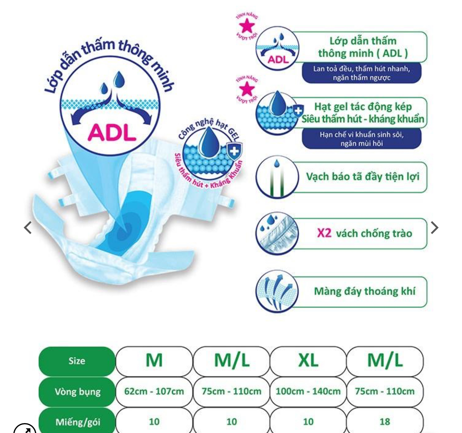 Lớp dẫn thấm thông minh (ADL) Giúp lan toả, phân tán đều chất lỏng, thấm hút siêu tốc và ngăn chất lỏng thấm ngược. Hạt GEL tác động kép thấm hút - kháng khuẩn