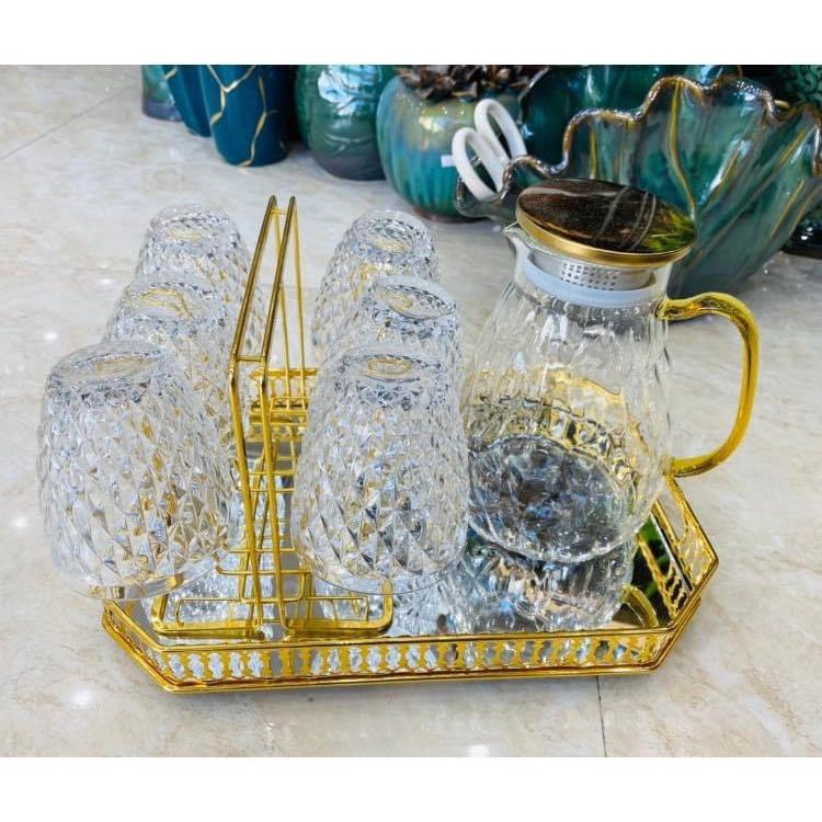 - Bộ combo bao gồm: 1 bình thủy tinh 1800ml + 6 cốc + 1 khay + 1 gía úp cốc kim loại mạ vàng ( khay giao ngẫu nhiên như hình dăng ) -Bình dung tích 1800ml. Nắp inox có zoăng cao su, đảm bảo an toàn cho sức khoẻ, thiết kế roong khit nắp chặt không lo bị rớt khi rót cạn nước