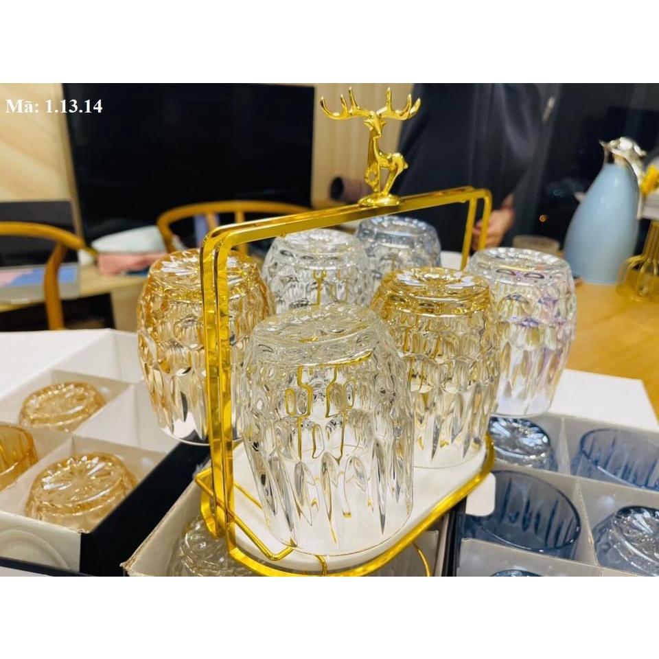 Combo Bộ 6 cốc thủy tinh cao cấp kèm giá úp tròn có khay hứng Combo gồm: 1 bình 6 cốc cốc 1 giá úp hươu 1 khay vương miện