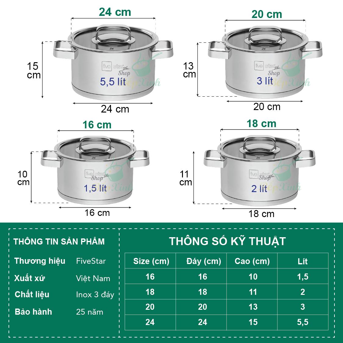 • Bộ nồi Inox 304 cao cấp 3 món 5 thứ : + Nồi cao cấp có nắp kích thước 16x8 cm + Nồi cao cấp có nắp kích thước 24x14 tcm + Chảo cao