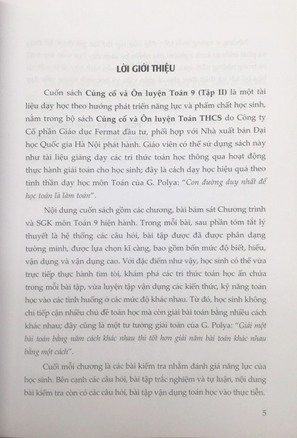 Trong những năm gần đây, việc dạy và học Toán theo chủ đề ngày càng nhận được sự quan tâm của giáo viên và học sinh các nhà trường, sử dụng các tài liệu tham khảo trong dạy học các môn học đã và đang trở thành nhu cầu thiết yếu. Các tác giả và Nhà xuất bản Đại học Quốc gia Hà Nội đã phối hợp để xuất bản bộ sách Củng cố và Ôn luyện Toán 9 THCS nhằm đáp ứng nhu cầu này của học sinh và giáo viên bộ môn Toán trong cả nước.