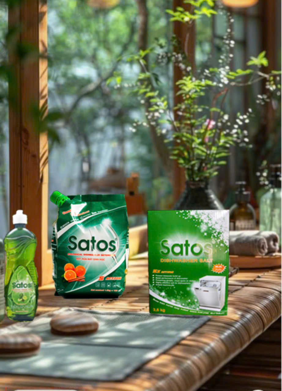 COMBO Bột rửa bát sinh học Satos+Muối 1.5kg+Bóng 800ml hữu cơ - Dùng cho máy rửa bát