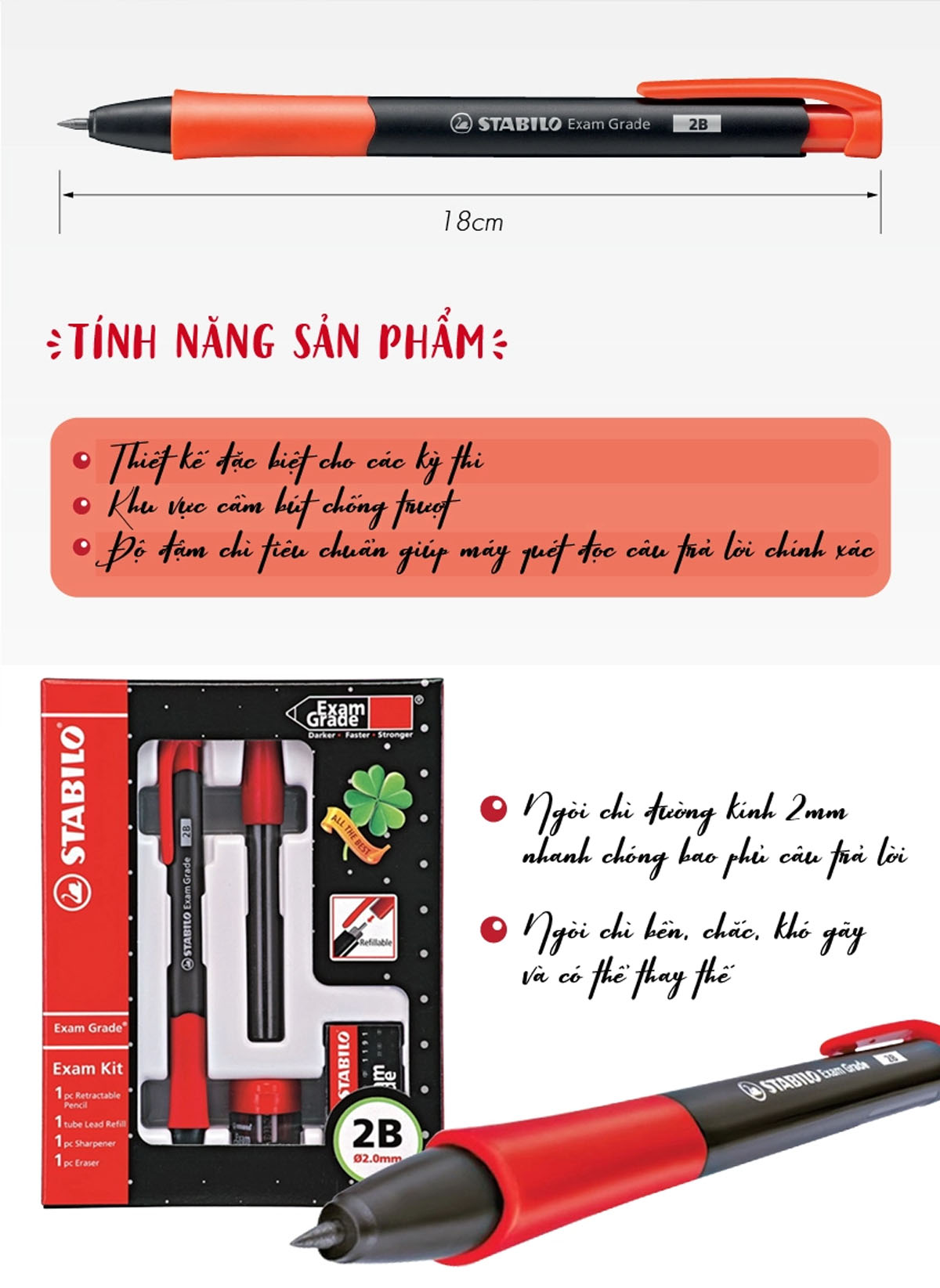 - Vị trí cầm bút có đệm cao su chống trơn - Bút chì bấm nét 2.0mm - Thích hợp dùng tô bài thi trắc nghiệm, vẽ thông thường - Được làm từ chất liệu