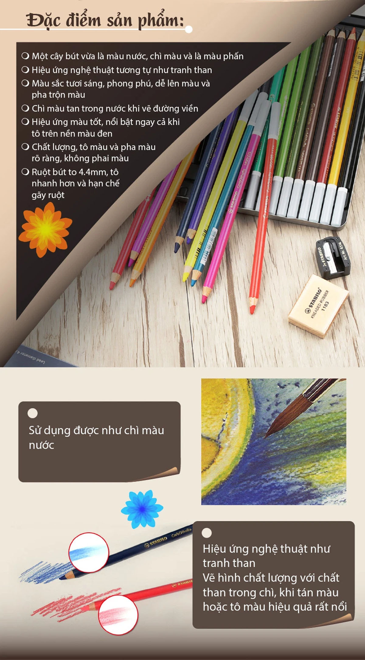 - Chất liệu: + Gỗ cao cấp, bút không dễ gãy dù có tác động lực mạnh trong khi tô hay vô tình làm rơi sản phẩm. + Chất màu chuẩn, chất lượng, tone màu tươi