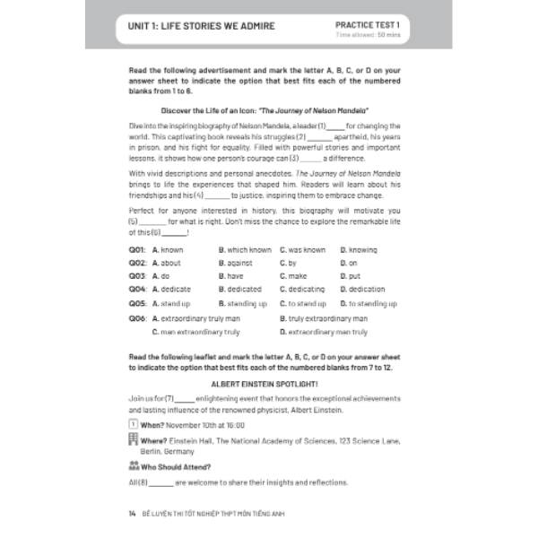 Đặc biệt, các đề thi được biên soạn theo chủ đề của từng đơn vị bài học trong sách giáo khoa Global Success lớp 12, nhờ vậy các em có thể vừa ôn luyện theo định dạng đề thi mới, vừa củng cố vốn từ và kiến thức nền theo chủ đề. Đồng thời, đây cũng là nguồn tài nguyên hữu ích để các thầy cô sử dụng trong quá trình giảng dạy tiếng Anh theo chương trình phổ thông.