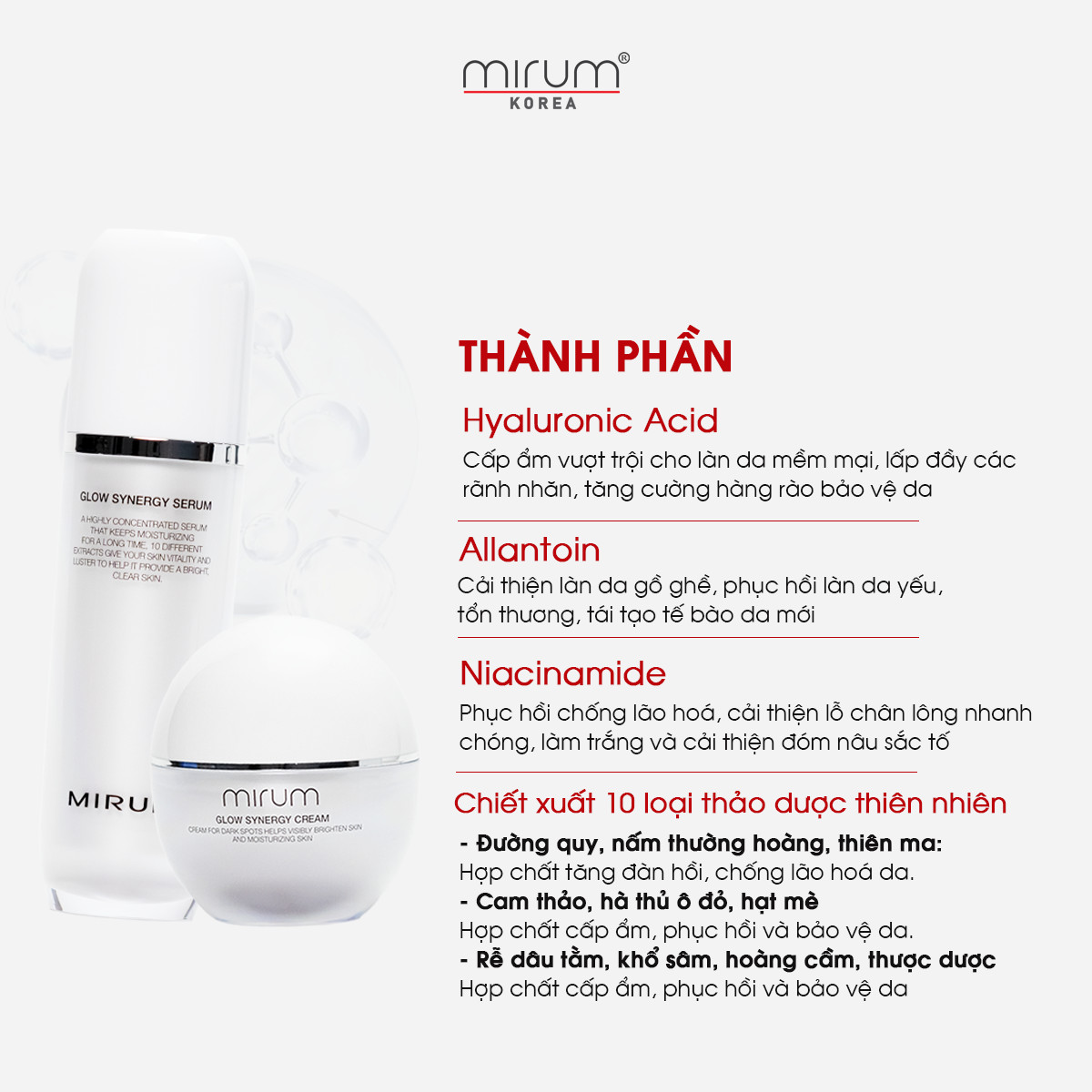 - Khuyên dùng: Trong vòng 12 tháng (kể từ ngày mở nắp). LOẠI DA PHÙ HỢP: Mọi loại da 01 Serum dưỡng trắng chuyên sâu, mờ nám & tàn nhang ( Mirum Glow Synergy Serum ) 01 Kem dưỡng trắng chuyên sâu, mờ nám & tàn nhang (Mirum Glow Synergy Cream ) THÀNH PHẦN