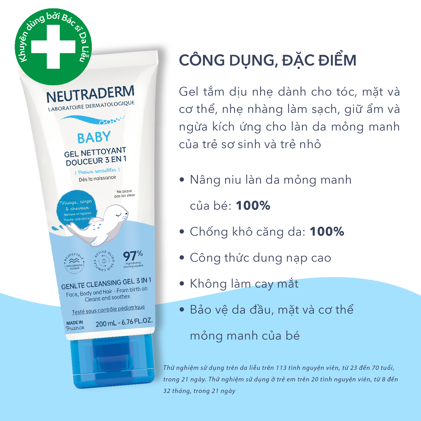 Gel Tắm Chăm Sóc Da Khô NEUTRADERM EXTRA RICH NEU Cách dùng: Đổ vài giọt vào tay và tạo bọt, nhẹ nhàng rửa sạch da mặt, da cơ thể và mái tóc của trẻ. Rửa sạch