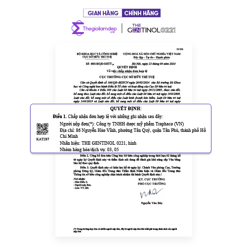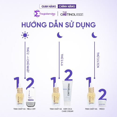 Combo Dưỡng Trắng, Căng Bóng Da, Chống Lão Hoá The Gentinol 0221 ĐỐI TƯỢNG SỬ DỤNG Phù hợp với tất cả các loại da Không dùng cho phụ nữ đang mang thai   THÀ̀NH PHẦN CHÍNH 1. Kem phân hủy sắc tố da Mela Off Cream The Gentinol 0221 2. Tinh chất siêu phân tử HA The Gentinol 0221 3. Kem Meso tái tạo da The Gentinol 0221 4. Kem phục hồi tái tạo làn da Innoblanc Cica Care   CÔNG DỤNG CHÍNH 1. Kem phân hủy sắc tố da Mela Off Cream The Gentinol 0221 - Giảm nếp nhắn - Hỗ trợ hiệu quả việc duy trì độ đàn hồi của da - Giúp giảm sự xuất hiện của nếp nhăn - Làm đều màu da - Dưỡng da trắng sáng và mịn màng - Giải quyết sắc tố trên da và giãn mao mạch song hành - Tác dụng kép: Ức chế enzyme tyrosinase & Peroxidase, ức chế Polyme hóa Indole, Chelat ion đồng và sắt, tăng glutahione nội bào, chống oxy hóa 2. Tinh chất siêu phân tử HA The Gentinol 0221 - Cấp ẩm - Làm mờ vết nhăn da - Hỗ trợ da căng bóng tự nhiên - Thúc đẩy khả năng tự tái tạo, phục hồi và trẻ hóa da - Tăng khả năng hấp thụ oxy, giúp da hoạt động mạnh mẽ, từ đó tăng cường khả năng hấp thụ 8 CÔNG DỤNG ĐEM ĐẾN GƯƠNG MẶT THON GỌN - Se khít lỗ chân lông - Săn chắc da - Cải thiện độ đàn hồi - Giảm nhăn da - Ngăn lão hóa da - Dưỡng da tươi sáng rạng rỡ - Nuôi dưỡng sau bên trong - Cải thiện làn da tối màu 3. Kem Meso tái tạo da The Gentinol 0221 - Da lão hóa, độ đàn hối kém, kết cấu da yếu, không đều màu là do hệ vi sinh trên da đã bị mất cân bằng - Tăng tỉ lệ tổng hợp collagen gấp 300% - Tăng sinh tế bào liên tục, làm chậm tiến trình lão hóa - Tái tạo mô da thông qua việc kích thích sản sinh các protein như collagen, elastin, fibroectin - Cải thiện độ đàn hồi toàn diện: giúp da tái tạo lại 29 nhân tố tăng trưởng, đánh thức các tế bào gốc rơi vào trạng thái ngủ yên 4. Kem phục hồi tái tạo làn da Innoblanc Cica Care - Công thức làm giảm tiến trình oxy hóa mạnh mẽ: bằng cách trung hòa các độc tố, kem phục hồi tái tạo da giúp giải độc da, đồng thời tối ưu hóa chức năng sửa chữa tự nhiên của da và hệ thống phòng thủ - Hỗn hợp chiết xuất từ Axit Hyaluronic phân tử thấp, chiết xuất centella asiatica, Glutathione, Niaciamide; giúp nuôi dưỡng độ ẩm của da, đảo ngược tình trạng mất nước, ô nhiễm, hỗ trợ khôi phục kết cấu trẻ trung và giúp làm mờ đi dấu châm chim, nếp nhăn   HƯỚNG DẪN SỬ DỤNG  1. Dùng theo thứ tự: - Sáng: Tinh chất HA siêu phân tử >Kem phân hủy sắc tố mela off  - Tối 2-4-6: Tinh chất HA siêu phân tử > Kem Cica care cream  - Tối 3-5-7-cn: Tinh chất HA siêu phân tử > Kem meso tái tạo mô da  2. Dùng sau các bước tẩy trang - rửa sửa rửa mặt. Thoa mỏng nhẹ, không thoa lên mụn viêm (nếu có), ban ngày sử dụng thêm kem chống nắng   ƯU ĐIỂ̉M NỔI BẬT Cấp ẩm tầng sâu  Căng bóng da cấp tốc Tái tạo hàng rào bảo vệ Chống Oxy hóa tối ưu Phục hồi hư tổn chuyên biệt