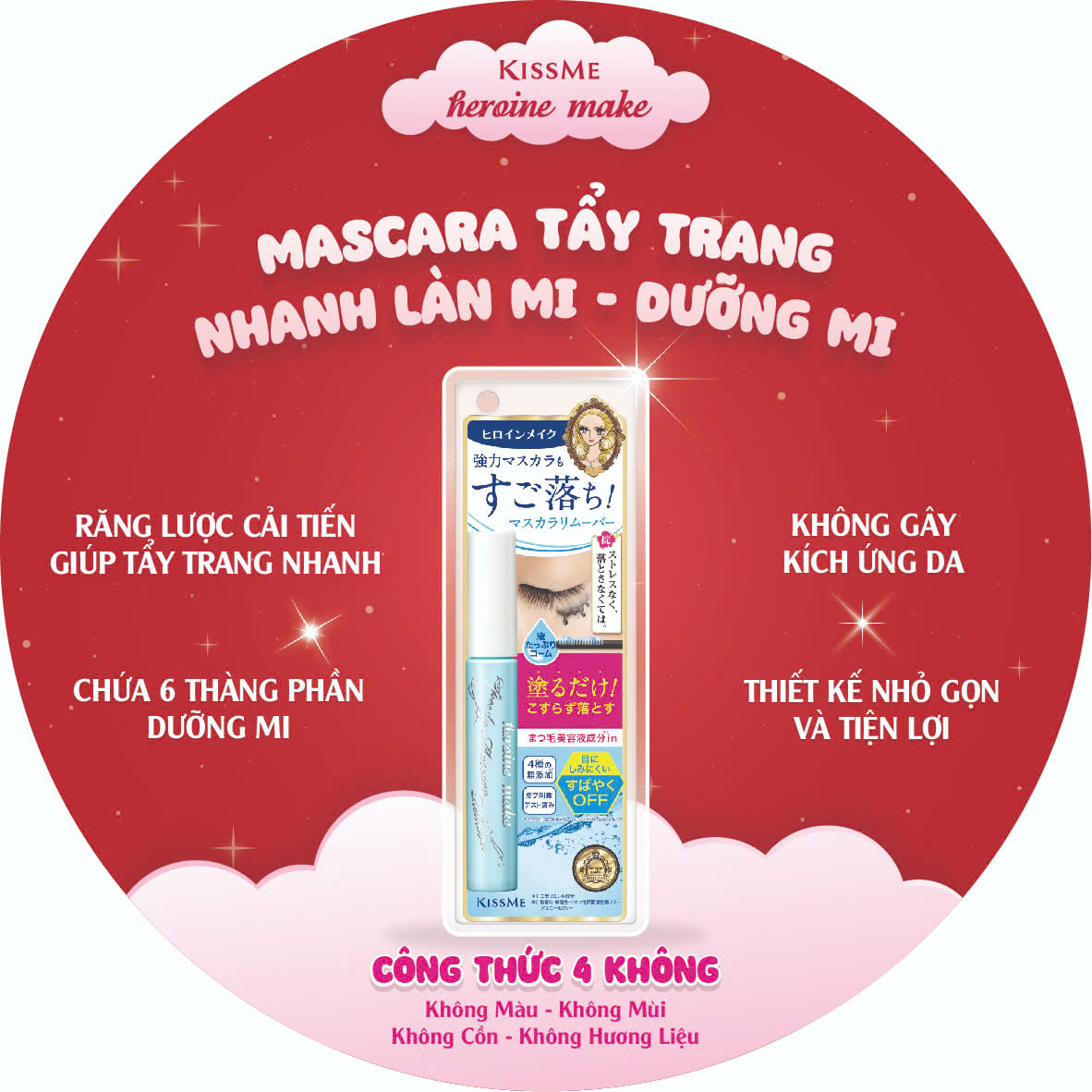 - Mascara Tẩy Trang Mi Kissme Heroine Make Speedy Mascara Remover (6,6mL) Số Lô: In trên sản phẩm Thương hiệu Kissme Xuất Xứ: Nhật Bản Thể tích thực: 6.6mL HSD: 5 năm kể từ ngày sản xuất Dung dịch tẩy trang mi sẽ hòa tan ngay lập bởi công thự cải tiến giúp loại bỏ nhẹ nhàng lớp mascara không thấm nước, ngoài ra thành phần tinh dầu hoa trà, sữa ong chúa nụ tầm xuân... có lượng ẩm cao giúp nuôi dưỡng làn mi chắc khoẻ và giảm gãy rụng khi sử dụng. 1/ Công dụng:
