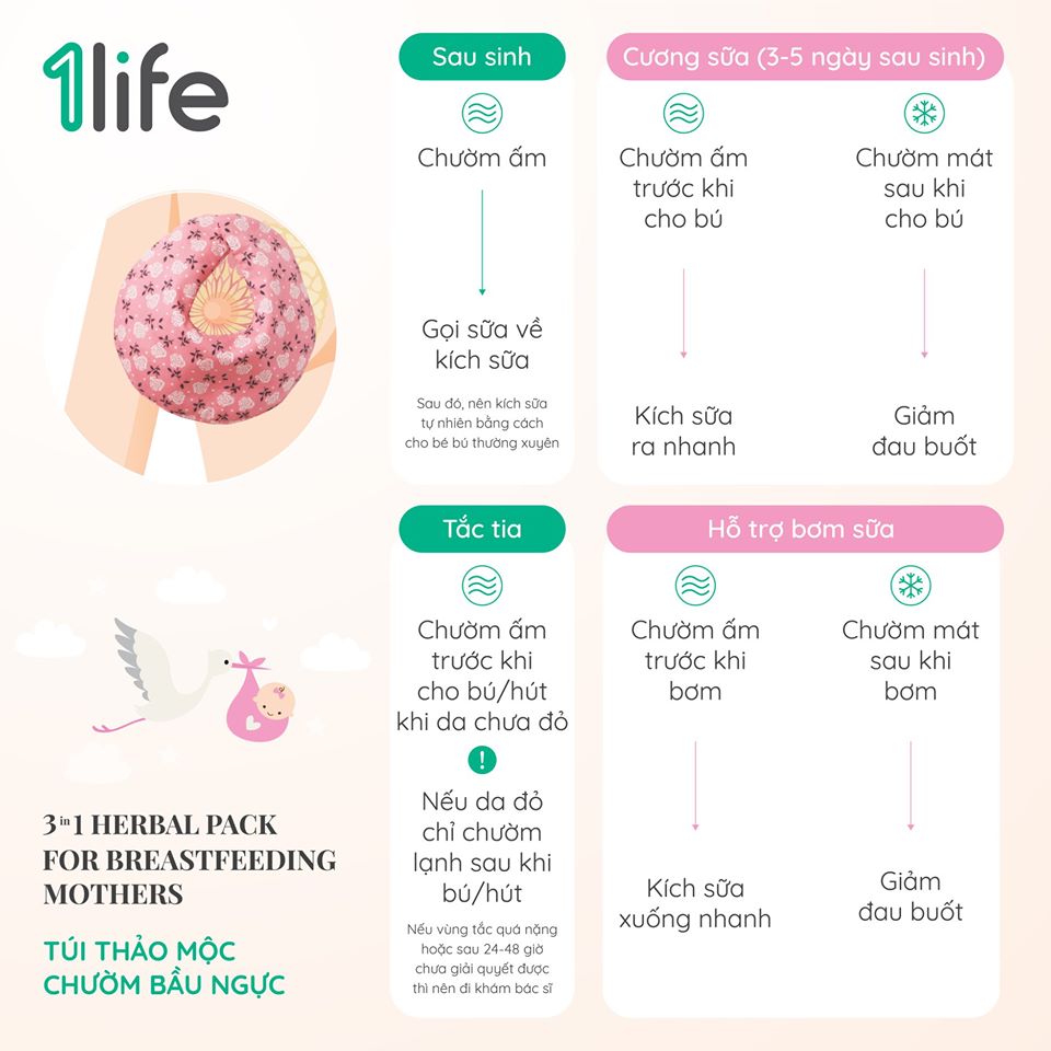 - Sử dụng với dụng cụ bơm sữa: làm nóng gối thảo mộc và bao bên ngoài phểu bơm sữa khi bơm Kiểm tra sự nóng/ lạnh bằng tay trước khi chườm Tái sử dụng đến 300 lần, thời gian nóng 20 phút mỗi lần sử dụng 1 hộp bao gồm 2 túi thảo mộc và 2 bao gối