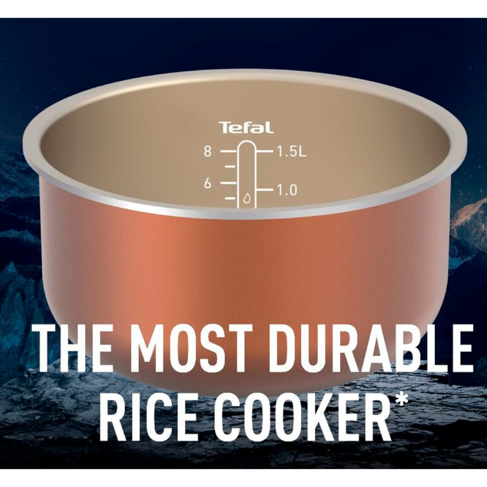 • Nồi cơm Tefal RK361168 bền nhất thế giới với lòng nồi bằng hợp kim nhôm và lớp phủ men vân đá chống dính, dày 4 lớp chắc chắn, chống rơi vỡ giúp kéo dài tuổi thọ.