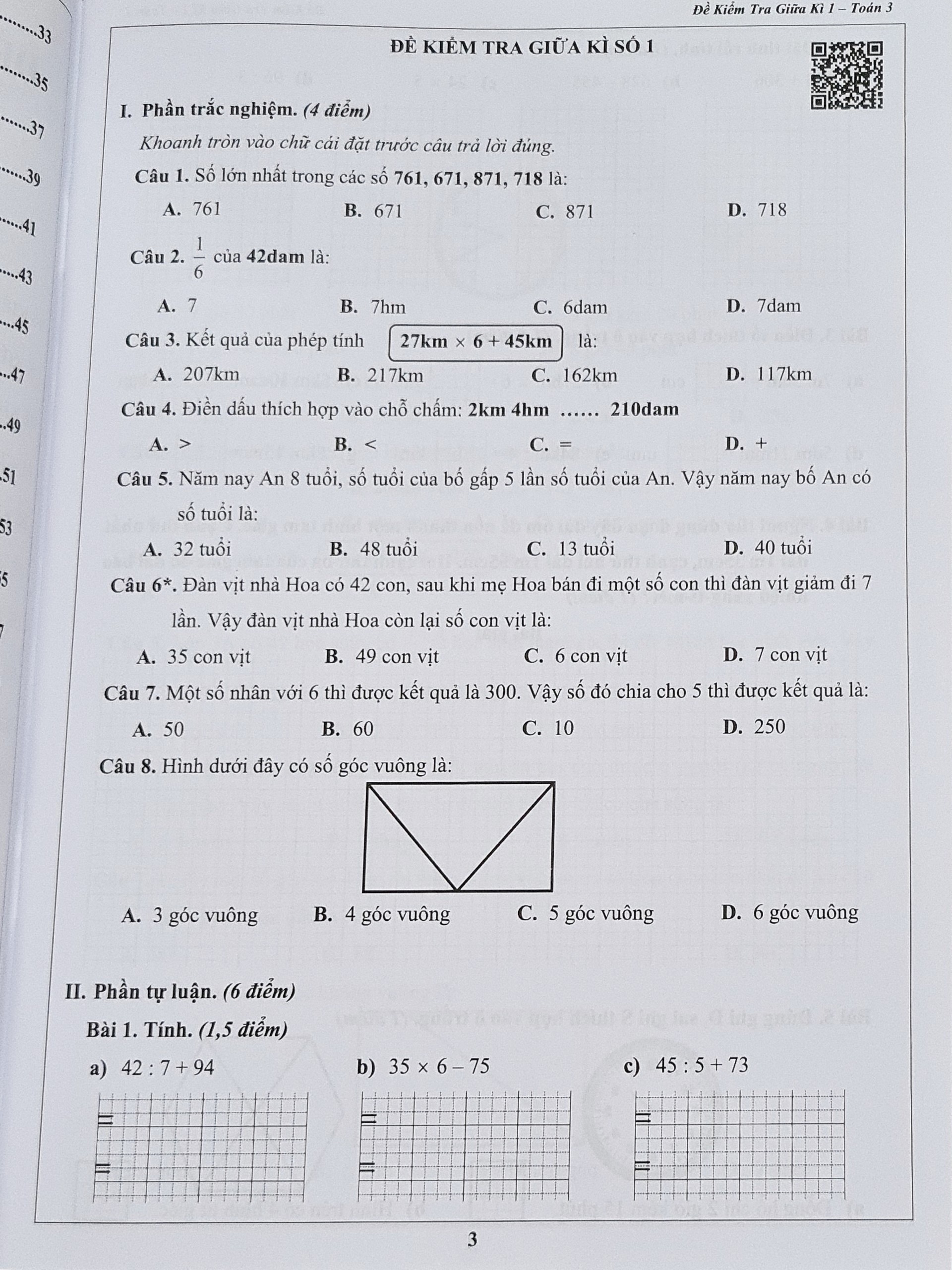 Đề số 1 | Đề kiểm tra giữa học kì 1 | Toán lớp 3 | Kết Nối | Thầy Nguyễn Văn Quyền