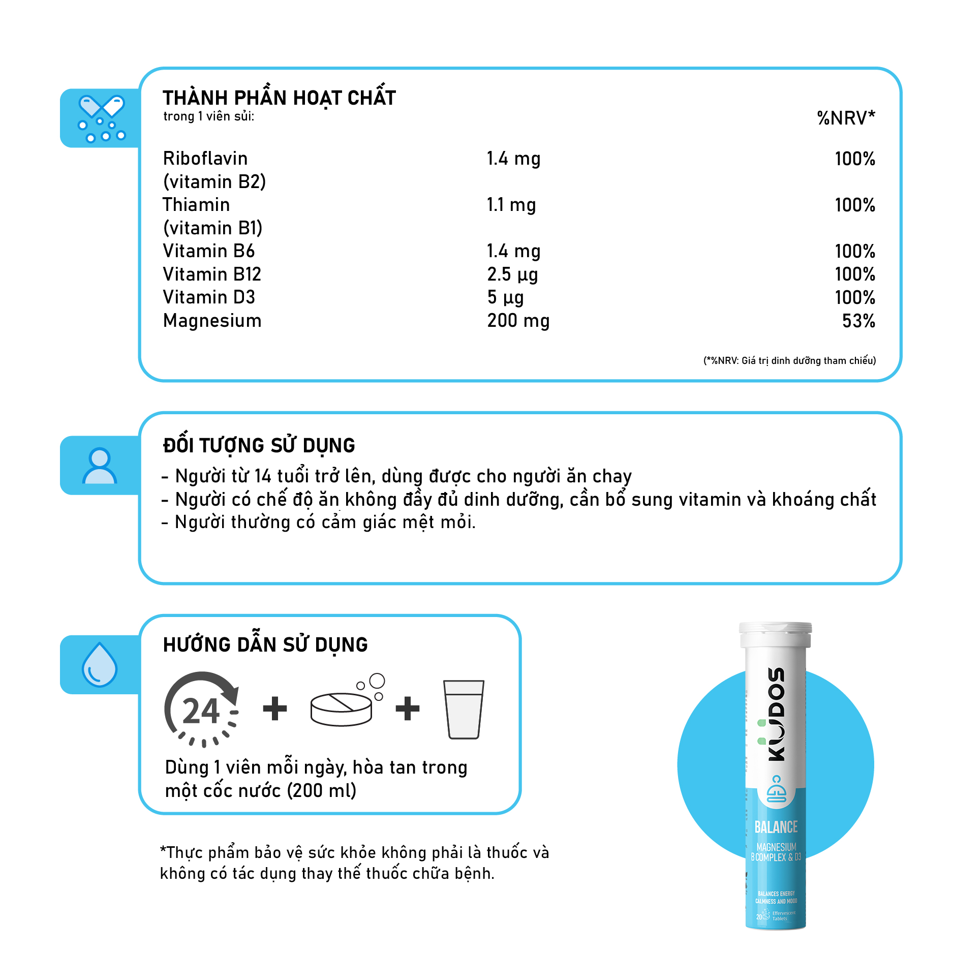 - Viên Sủi Magie + Vitamin nhóm B KUDOS BALANCE Bổ sung vitamin (B1, B2, B6, B12, D3) và magnesi cho cơ thể.