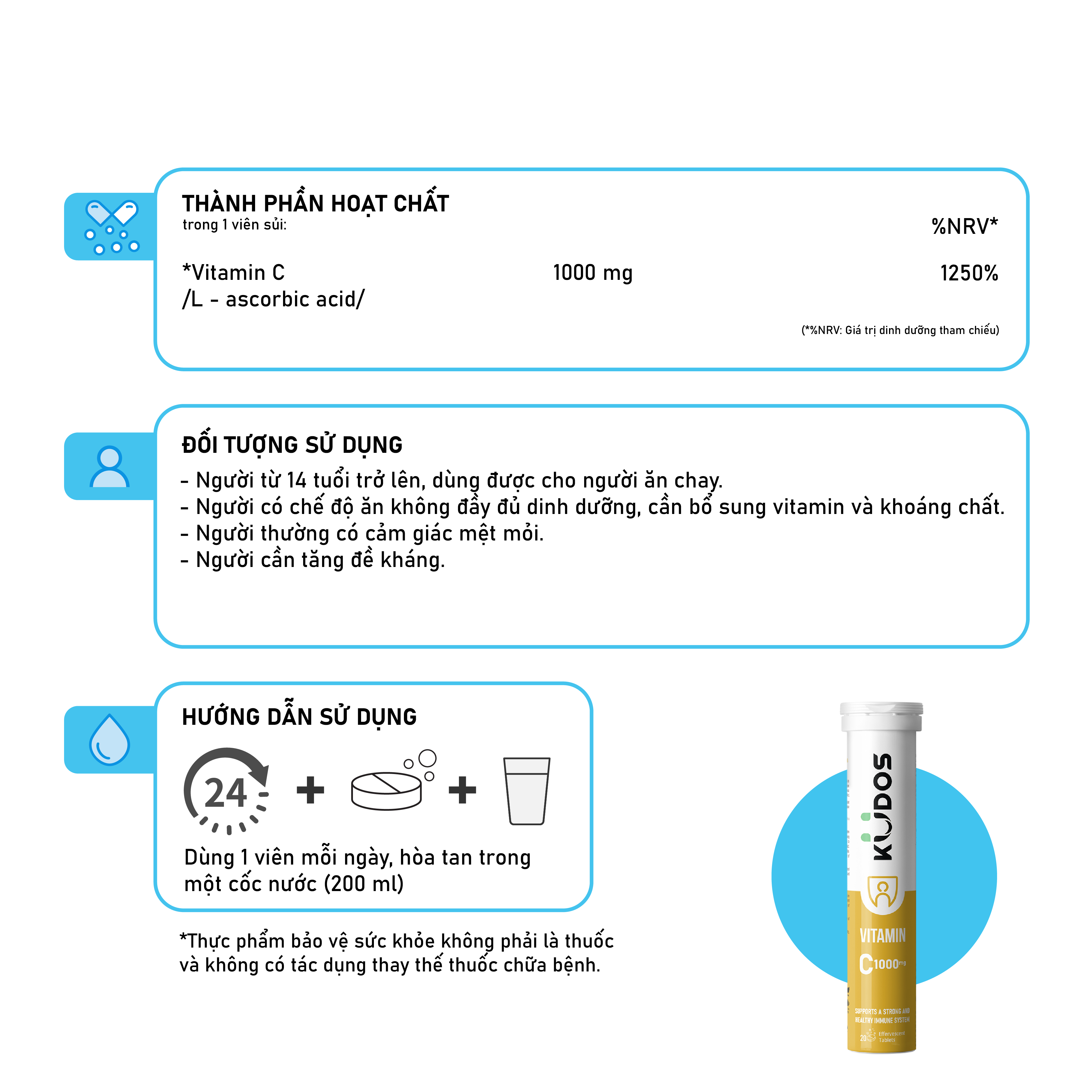 - Viên Sủi KUDOS VITAMIN C 1000MG Trong mỗi viên sủi 4,1 g chứa: Vitamin C (Acid L-ascorbic): 1000 mg Đối tượng sử dụng: