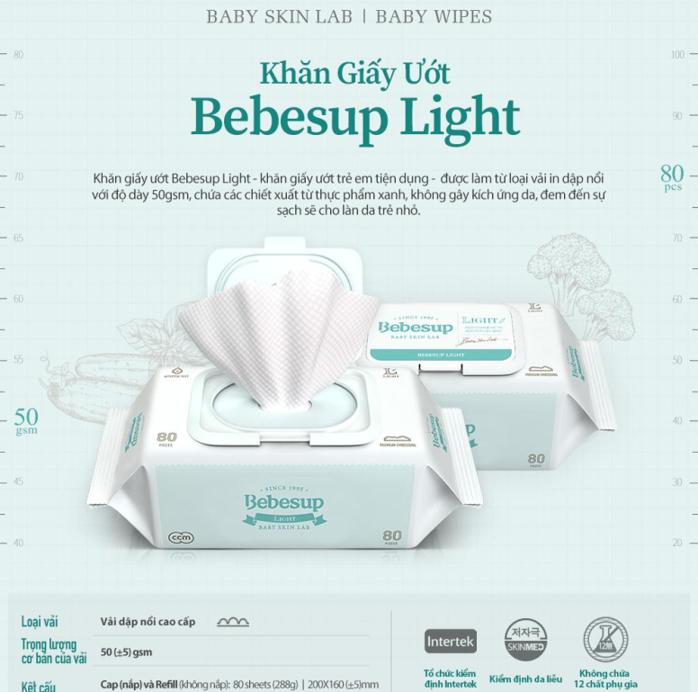 BEBESUP LIGHT là sản phẩm khăn ướt đại diện cho phòng nghiên cứu Baby skin lab. Khăn giấy ướt cao cấp bebesup LIGHT là loại đặc biệt dành cho trẻ sơ sinh và trẻ có