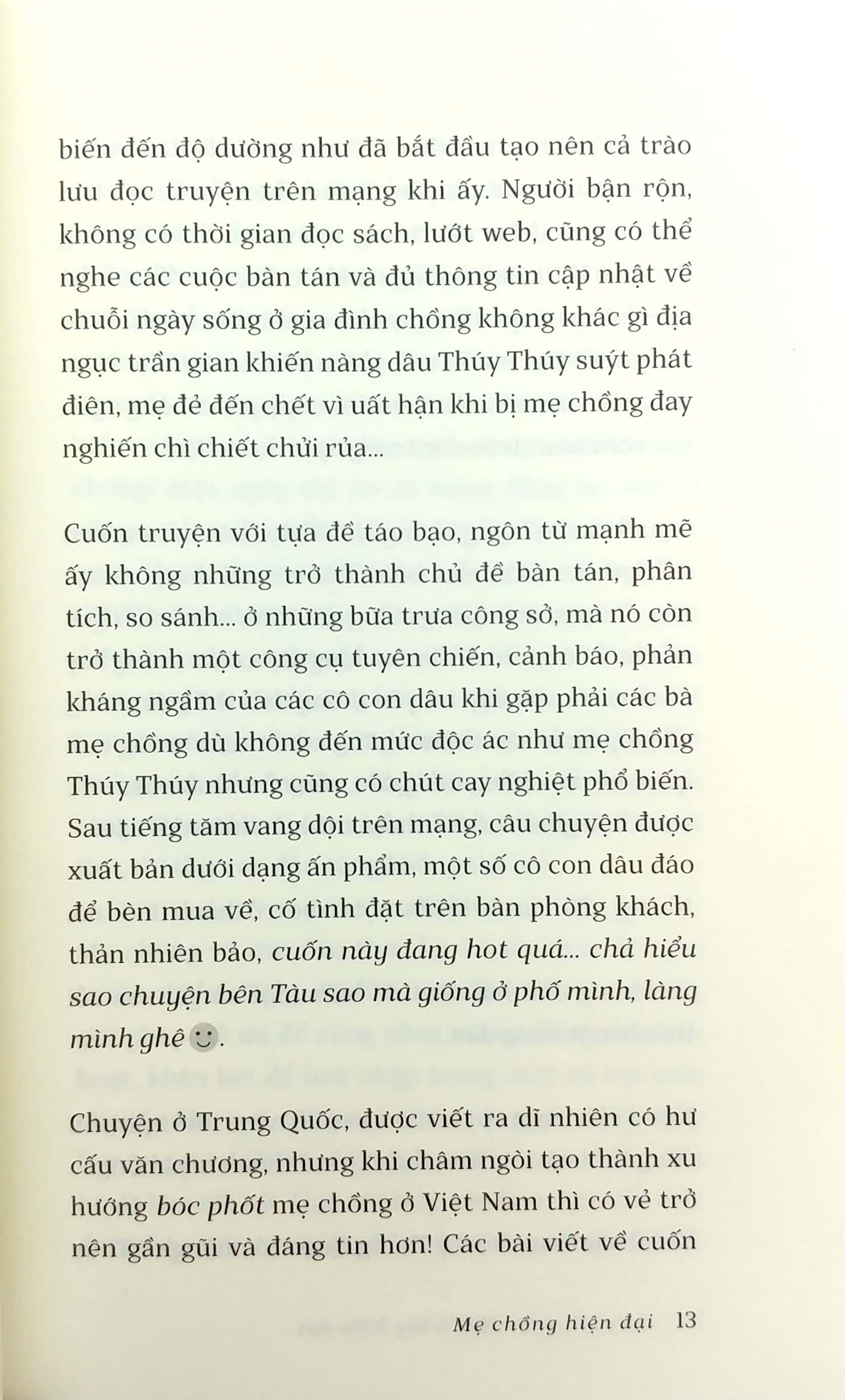 “Cuốn sách này tôi muốn dành tặng tất cả những bà mẹ có con trai và con gái. Có con trai, thì chúng ta sẽ là mẹ chồng, còn nếu có con gái thì con chúng ta cũng có thể sẽ đi làm dâu một bà mẹ chồng nào...