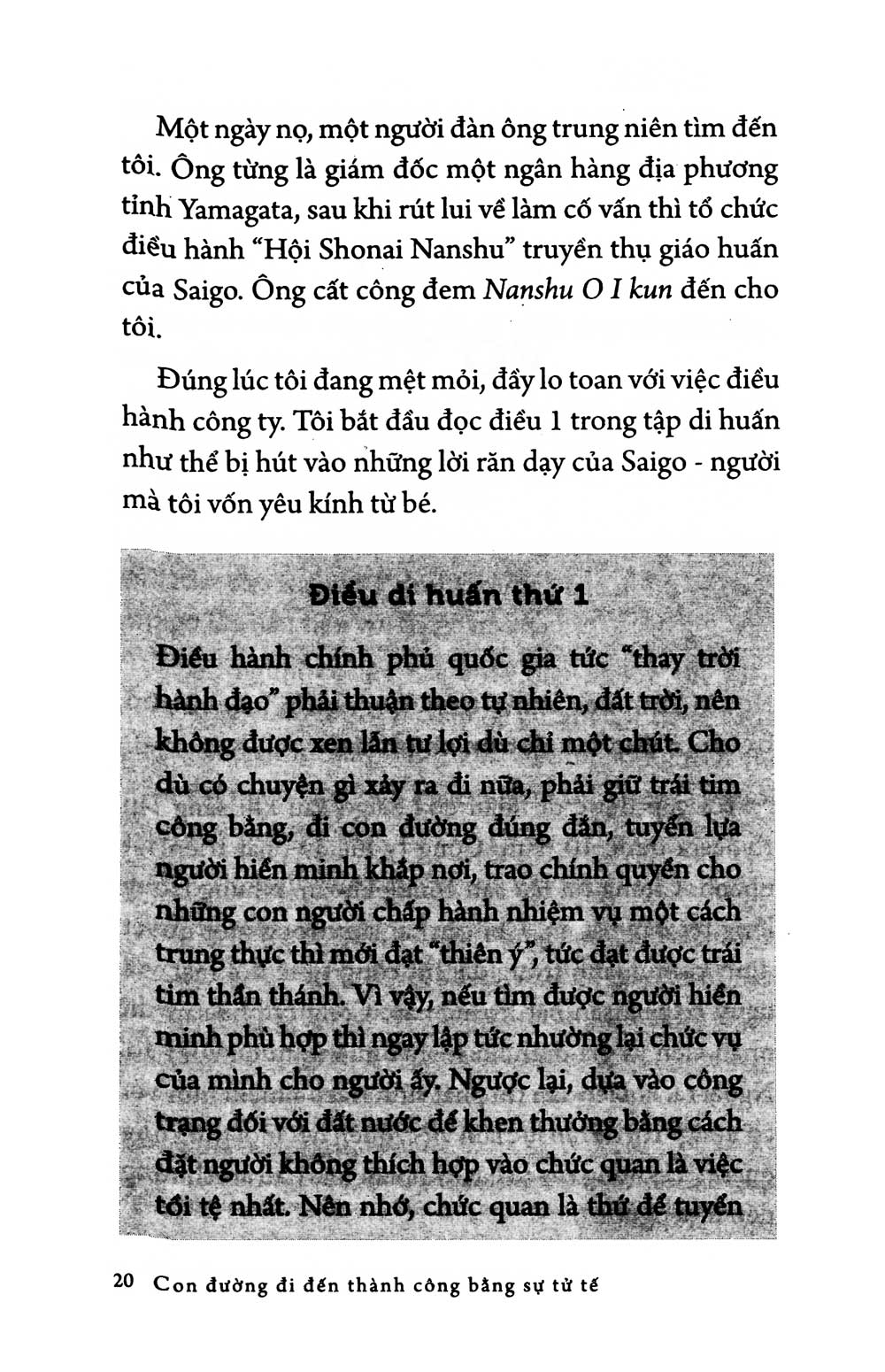 Đây là một cuốn sách "2 trong 1", bạn đọc sẽ được tìm hiểu cùng một lúc, triết lý kinh doanh của một nhà kinh doanh tài ba hàng đầu Nhật Bản hiện đại - Inamori Kazuo, và tư tưởng làm người mẫu mực của một võ sĩ samurai chân chính bậc nhất nước Nhật thời Minh Trị Duy Tân - Saigo Takamori.