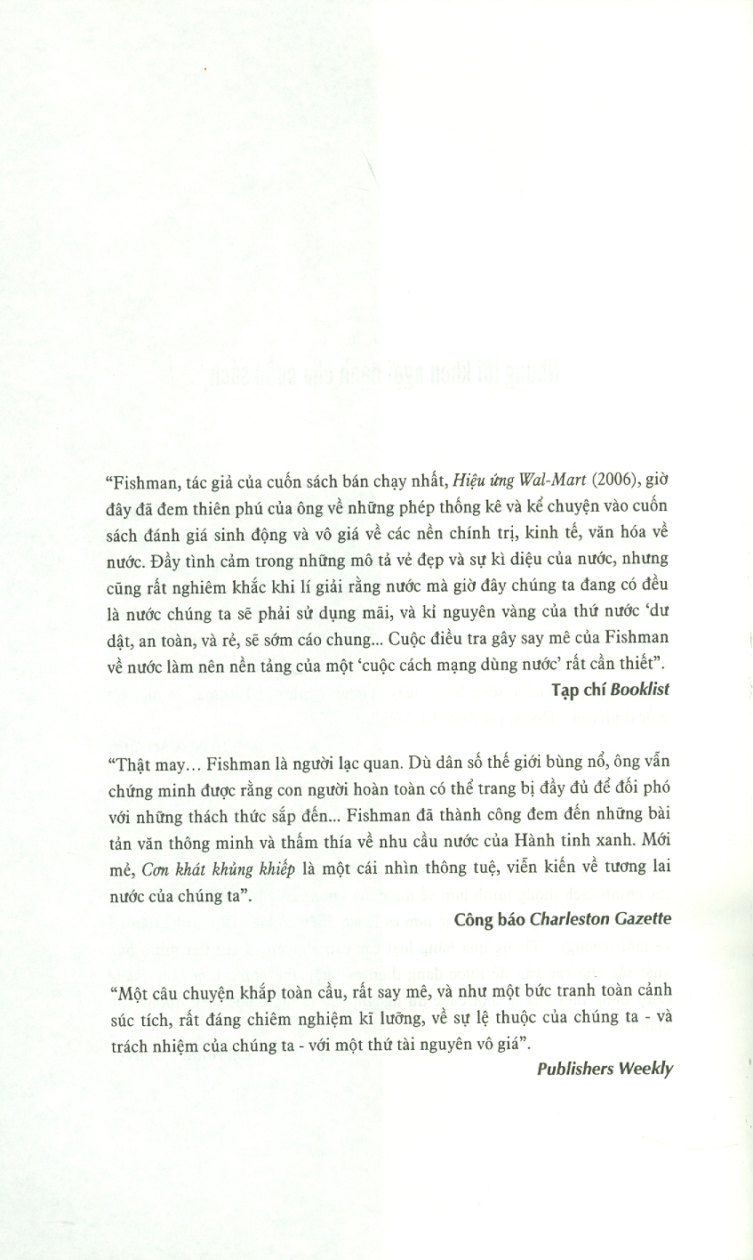 “Fishman, tác giả của cuốn sách bán chạy nhất, Hiệu ứng Wal-Mart (2006), giờ đây đã đem thiên phú của ông về những phép thống kê và kể chuyện vào cuốn sách đánh giá sinh động và vô giá về các nền chính trị, kinh tế, văn hóa về nước. Đầy tình cảm trong những mô tả vẻ đẹp và sự kì diệu của nước, nhưng cũng rất nghiêm khắc khi lí giải rằng nước mà giờ đây chúng ta đang có đều là nước chúng ta sẽ phải sử dụng mãi, và kỉ nguyên vàng của thứ nước dự dật, an toàn, và rẻ, sẽ sớm cáo  Cuộc điều tra gây say mê của Fishman về nước làm nên nền tảng của một cuộc cách mạng dùng nước rất cần thiết” - Tạp chí Booklist