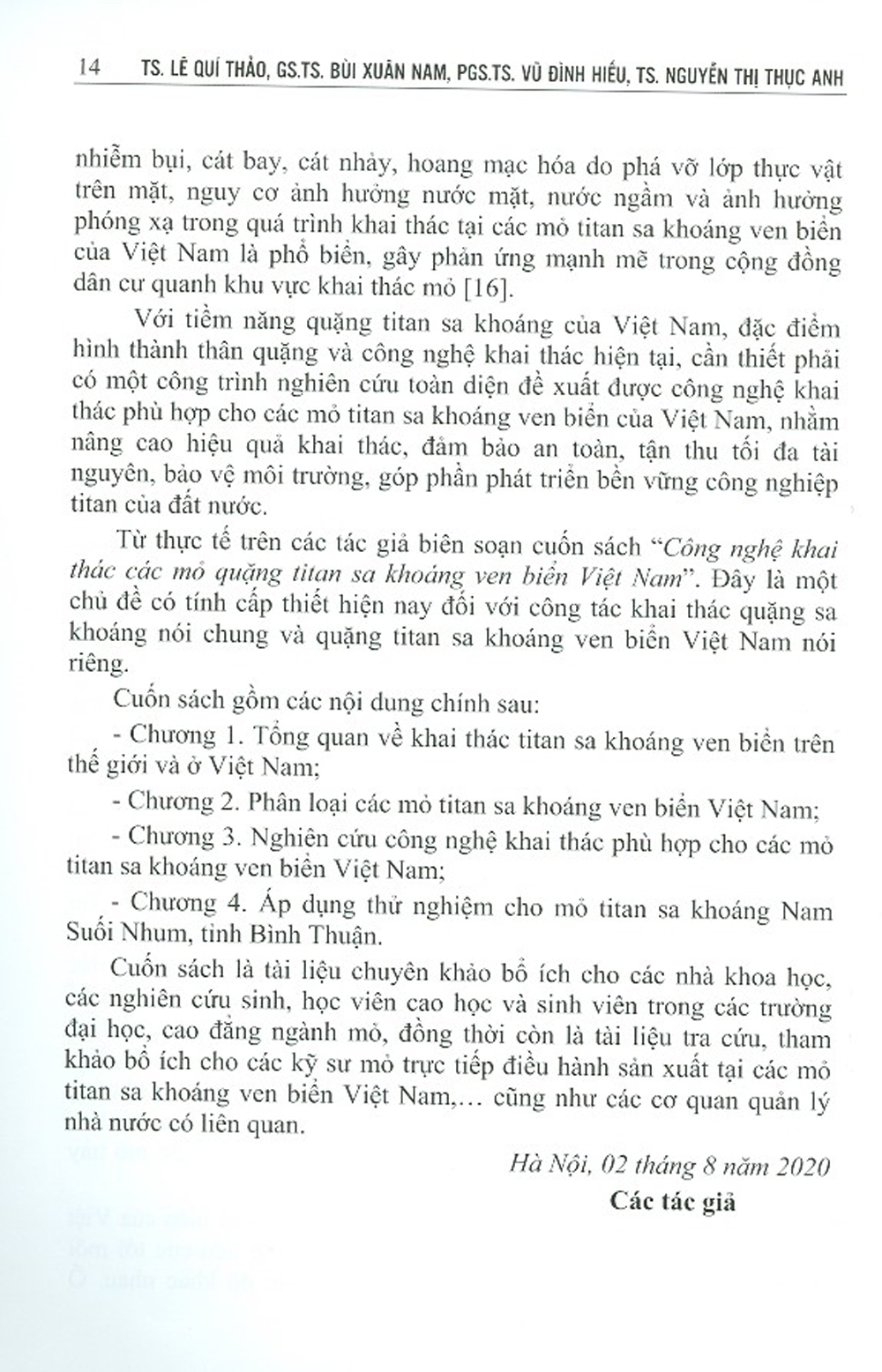 Mua tại TiktokNội dung bao gồm: Tổng quan về khai thác titan sa khoáng ven biển trên thế giới và ở Việt Nam; Phân loại, nghiên cứu công nghệ khai thác phù hợp cho các mỏ titan sa khoáng ven biển Việt Nam; Áp dụng thử nghiệm cho mỏ titan sa khoáng Nam Suối Nhum, tỉnh Bình Thuận.