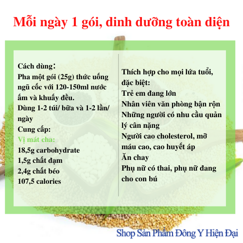Tên Sản phẩm: Bữa ăn dinh dưỡng Trùng thảo Vị Matcha – Thiên Sư Thành phần: Bột ngũ cốc tổng hợp, bột chiết xuất yến mạch, xơ hòa tan, matcha, bột yến mạch ăn liền, bột psyllium, protein đậu nành, lecithin, Tricalcium Phosphate, bột cỏ lúa mạch, chiết xuất sơ ri, Vanillin,  trùng thảo, chiết xuất linh chi, non-dairy creamer, Fructose, Bột hương sữa. Công dụng: Bổ sung dinh dưỡng toàn diện VỊ MATCHA Matcha: Lá trà xanh, bảo toàn chất dinh dưỡng Trùng thảo; Thúc đẩy sự trao đổi chất và loại bỏ mệt mỏi Linh chi; Tăng cường chức năng miễn dịch Xơ hòa tan ; Thúc đẩy nhu động ruột và cải thiện tình trạng táo bón Yến mạch; Giàu chất xơ, ít calo Lecithin; Làm chậm lão hóa, bảo vệ gan, bổ não, làm đẹp Cỏ lúa mạch; Axit amin peptit làm đẹp da, thúc đẩy tiêu hóa Sơ ri; Vua của vitamin C tự nhiên Đối tượng sử dụng: Thích hợp cho mọi lứa tuổi, đặc biệt: Trẻ em đang lớn Phụ nữ có thai, phụ nữ đang cho con bú Những người có nhu cầu giảm cân & quản lý cân nặng Người cholesterol cao, mỡ máu cao, huyết áp cao Những người tập luyện Thể dục thể thao Những người Ăn chay Nhân viên văn phòng bận rộn Người cao tuổi