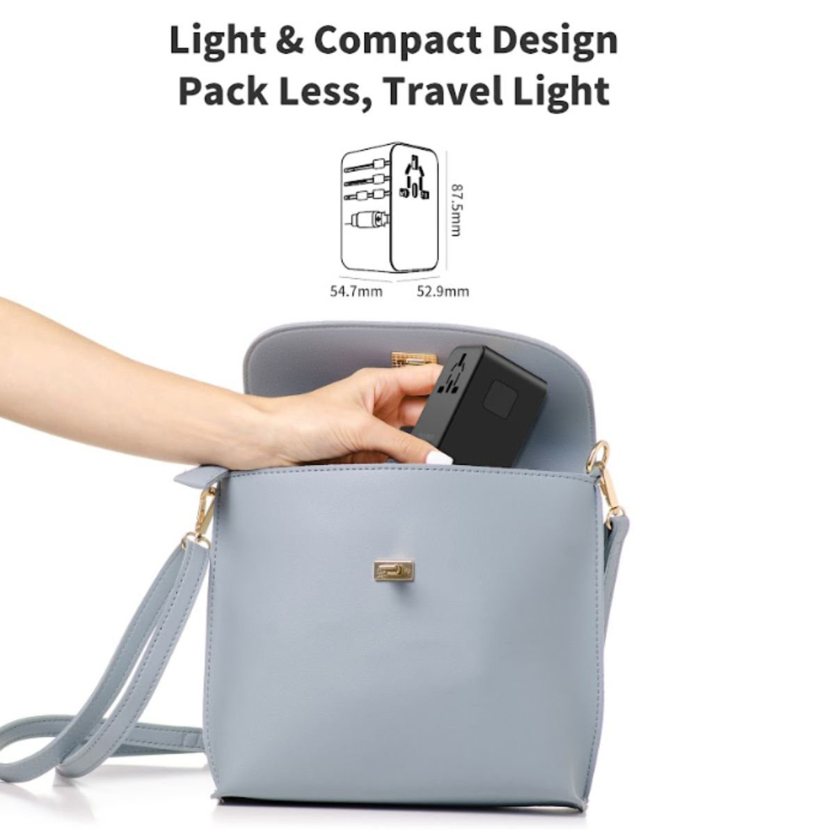 - Sản phẩm được thiết kế nhỏ gọn, chỉ có kích thước 87.5 x 54.7 x 52.9 mm nằm trong lòng bàn tay, dễ dàng bỏ vào túi xách hay ba lô. Tuy nhỏ gọn nhưng lại tích hợp 3 cổng sạc đa dạng bao gồm: 1 cổng USB Type C và 2 cổng USB A, bạn có thể sạc đa dạng các thiết bị như điện thoại, máy tính bảng, laptop, tai cùng lúc, mang lại sự tiện lợi tối đa cho mỗi chuyến đi.