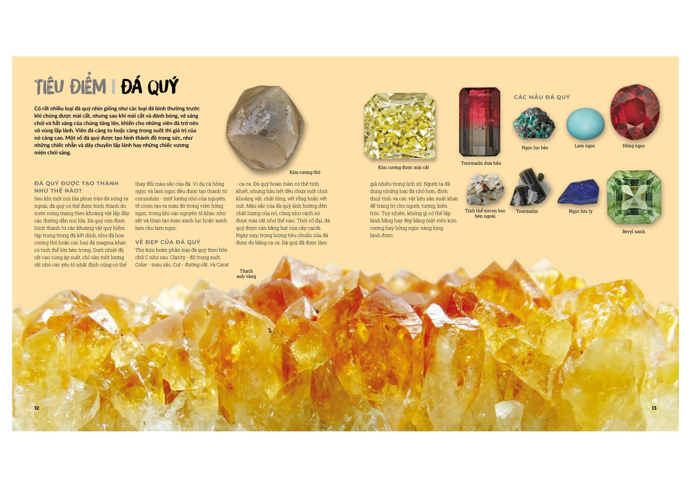 Trong cuốn sách này, tập trung tìm hiểu 3 chủ đề chính: KHOÁNG SẢN – ĐÁ – ĐÁ QUÝ, Mỗi chủ đề lại được phân tách và đi vào chi tiết của từng loại:KHOÁNG SẢN: Ở chủ đề này, các bạn sẽ được đi tham quan phòng trưng bày khoáng sản ( đồng/than chì/sắt/vàng/bạc…) Bạn sẽ biết chúng chính là phần còn lại của thiên thạch đến từ vùng không gian giữa các hành tinh bay vào khí quyển, bị cháy mất một phần và rơi xuống bề mặt Trái Đất. Ngoài ra, khám phá thông tin và các kiến thức bổ ích của 10+ khoáng chất khác, biết được khoáng vật tạo đá cấu thành nên 60% vỏ Trái Đất, nó gần như có mặt ở khắp mọi nơi trên vỏ Trái Đất hay tinh thể có cấu trúc tốt thường được dùng làm đá quý hay giả kim cương…